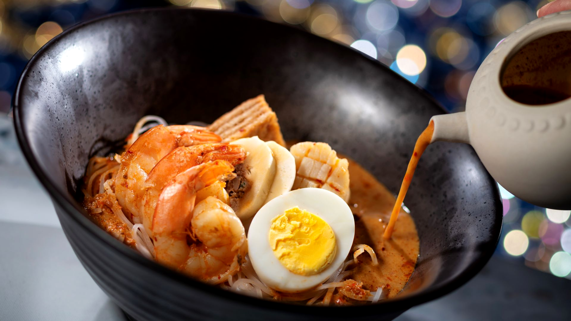 • Savory items include the Hainanese Chicken Rice with sweet dark soy sauce, ginger garlic sauce, and chili sauce, and the Laksa Lemak with prawn, Tau pok, laksa leaf, and chili.