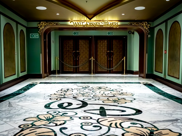 - Immediately, Disney Cruise Line devotees may realize that the Walt Disney Theater entrance features a sign that is not carved or dimensional, instead featuring a flat panel sign over the doors. This could likely be an alternate entrance, or one of several.