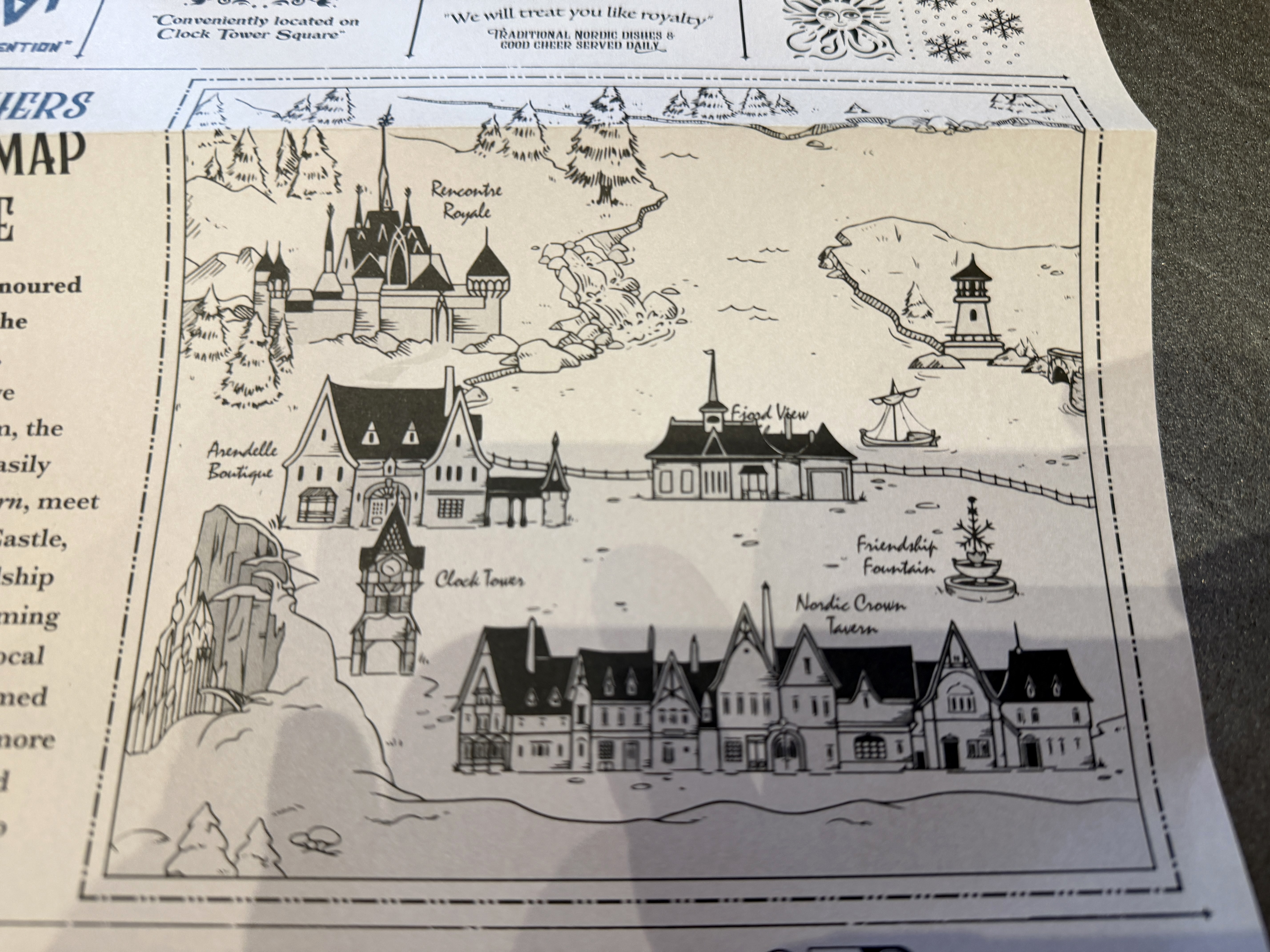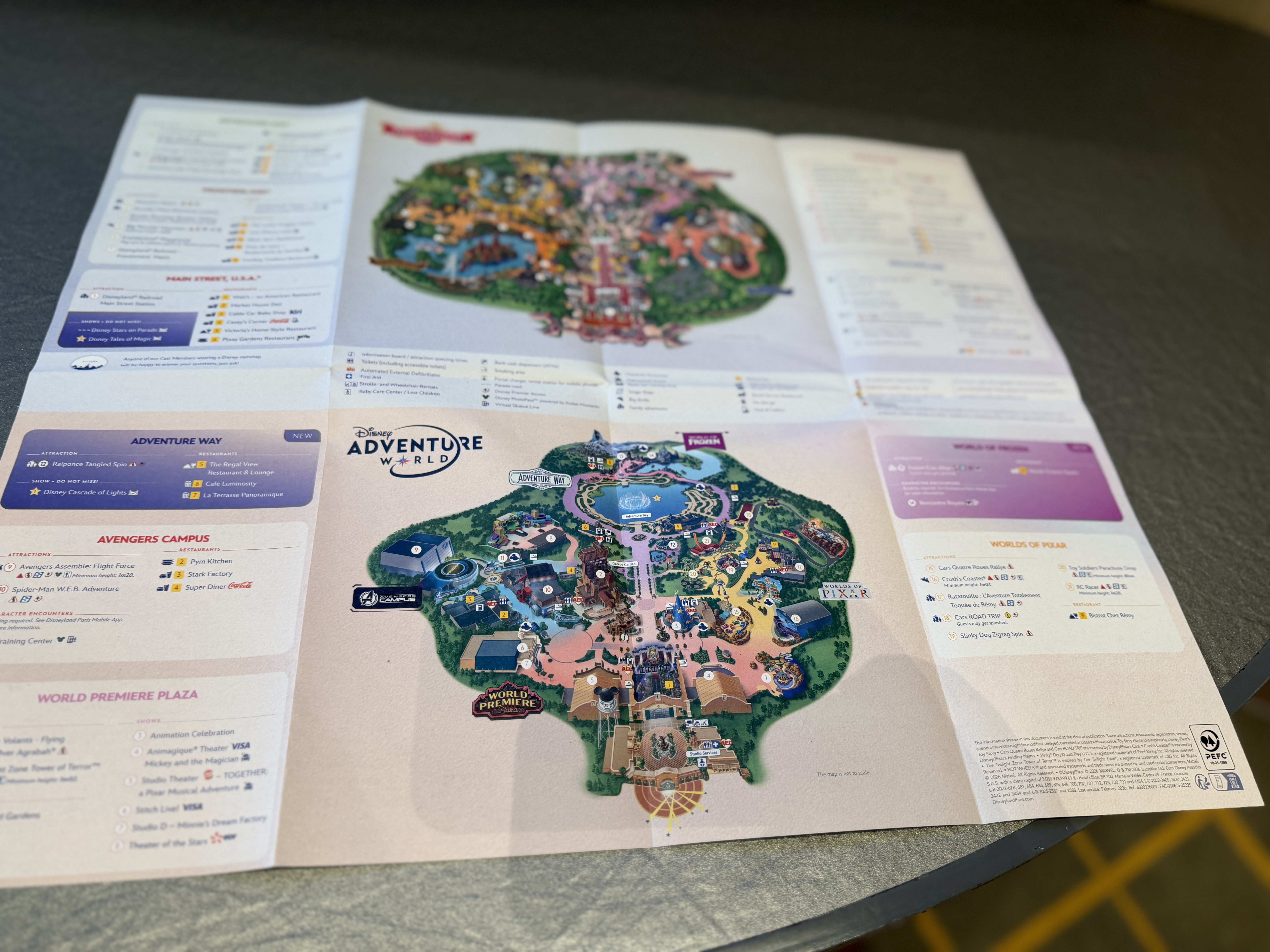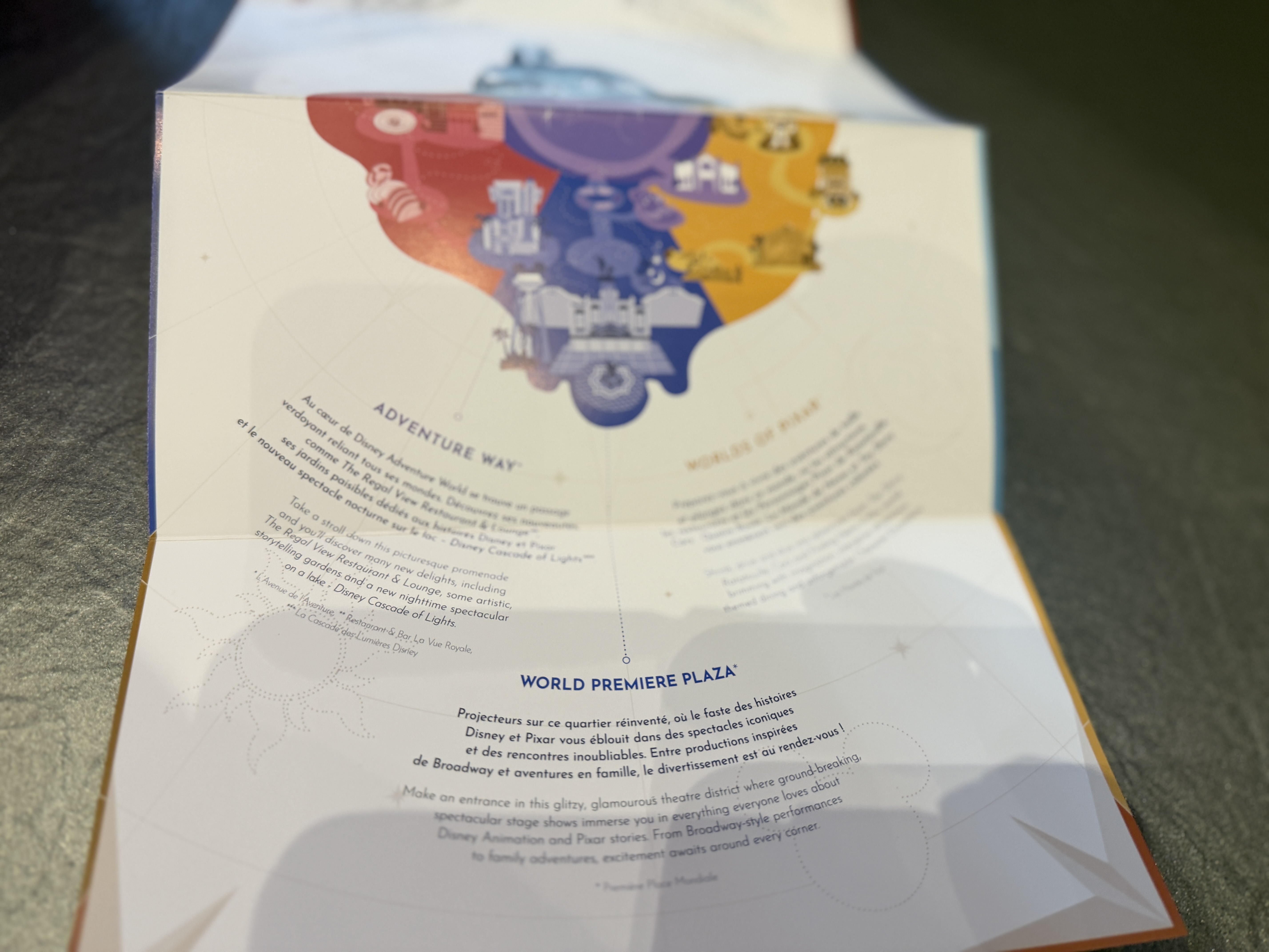 In the case of the side showcasing Disney Adventure World, we see the full and complete map of the park, including the new World of Frozen, Adventure Way, and Adventure Bay.
