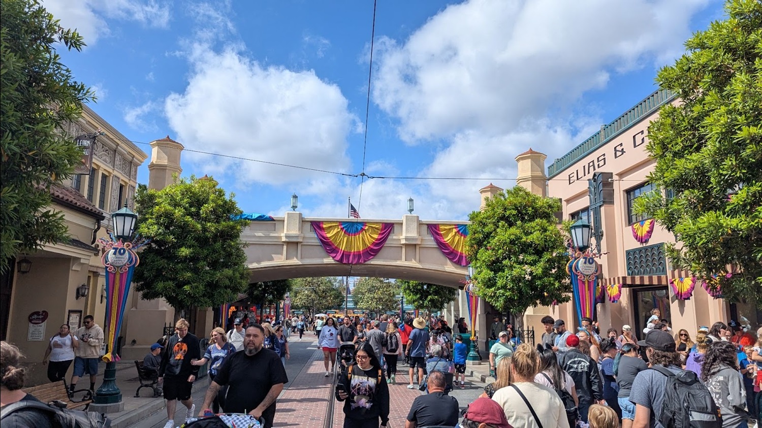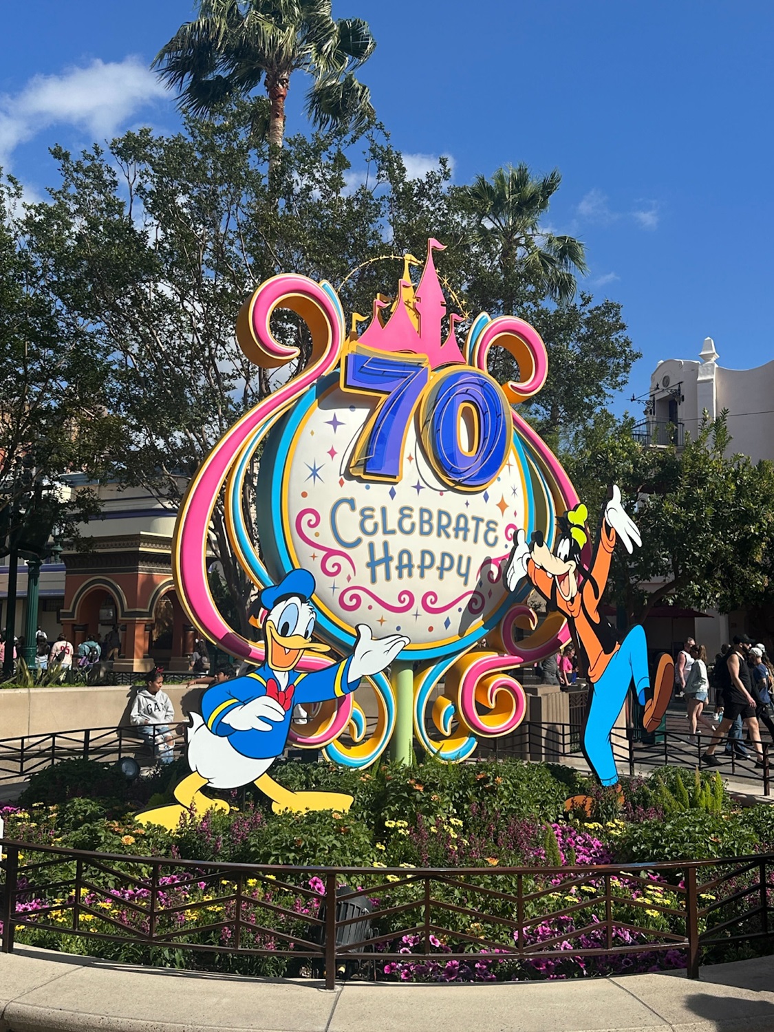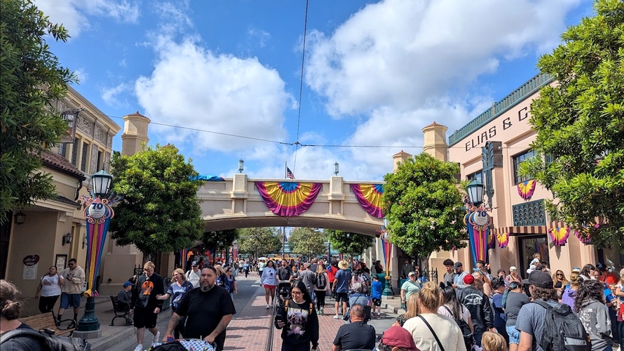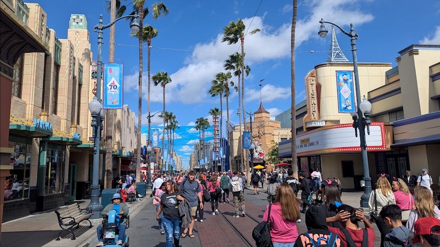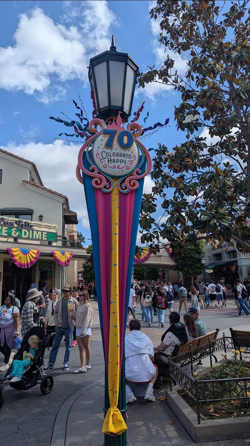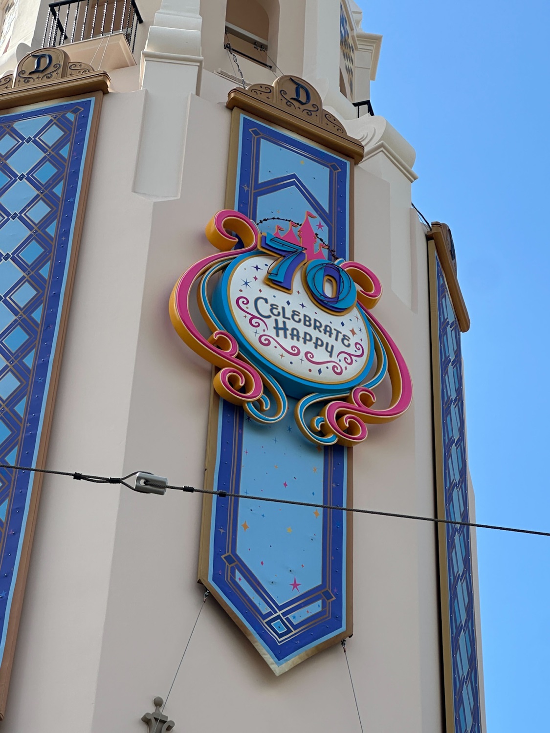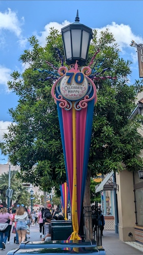 Heading into Hollywood Land, blue Disneyland 70th logo banners are hanging all up and down the street.
