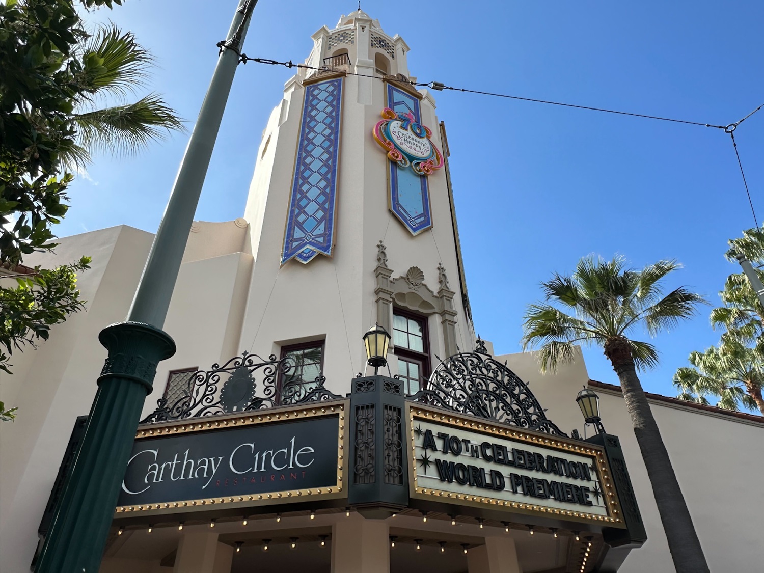 Of course, the main icon of Disney California Adventure, the Carthay Circle Theater, is all decked out with a similar sign, alongside blue banners.