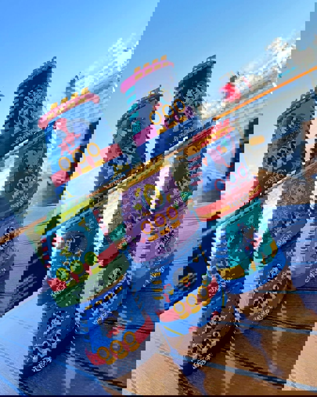 - Each one features a color different color scheme (unlike the actual cruise ship funnels) and features stylized images of the characters that are featured on each ship's aft. At the base, the name of the ship.