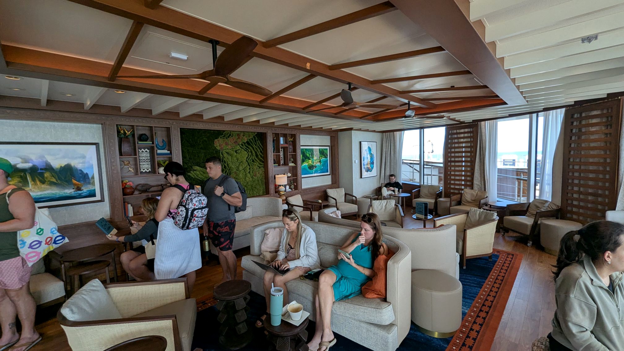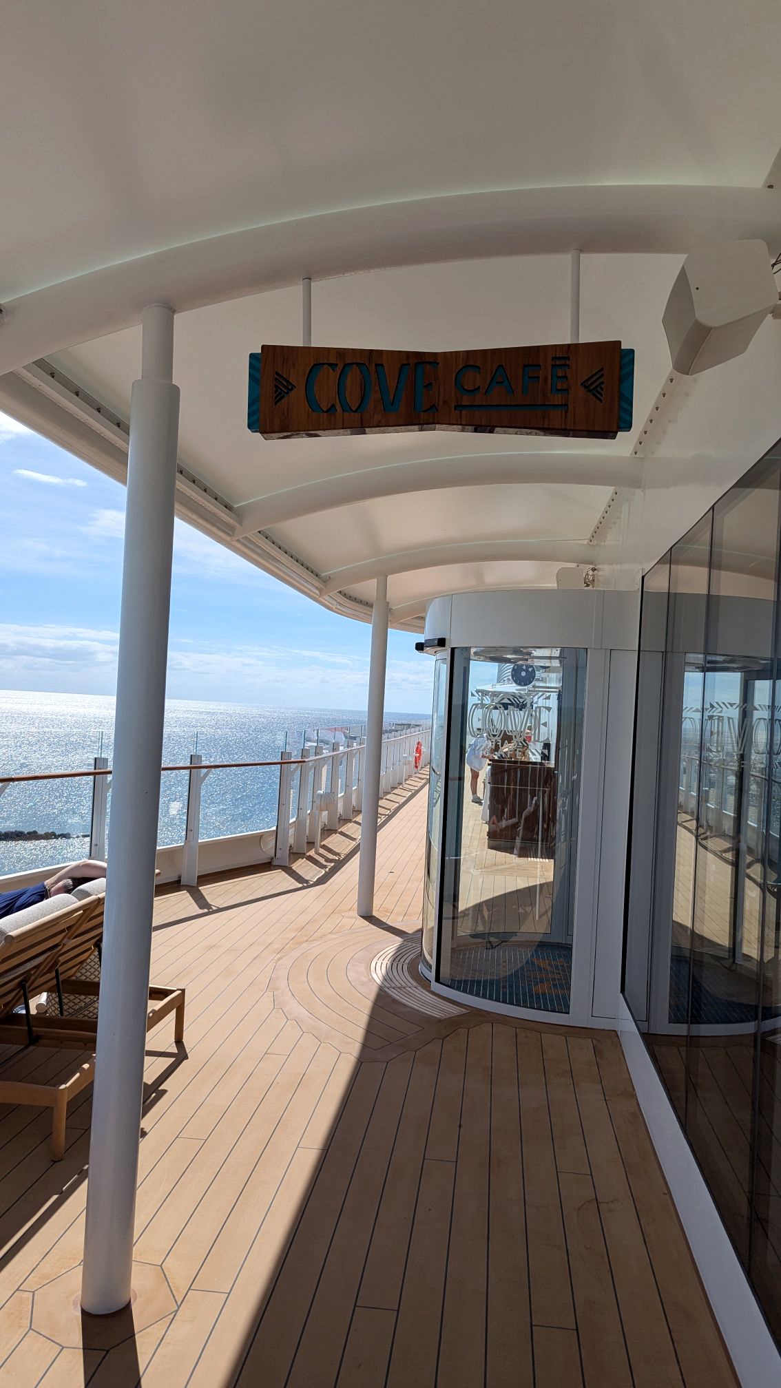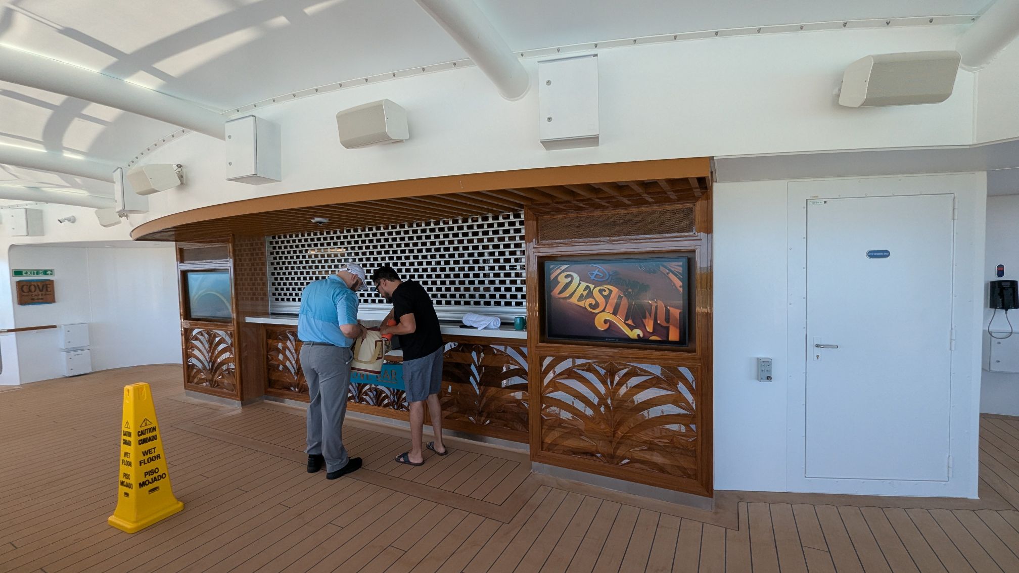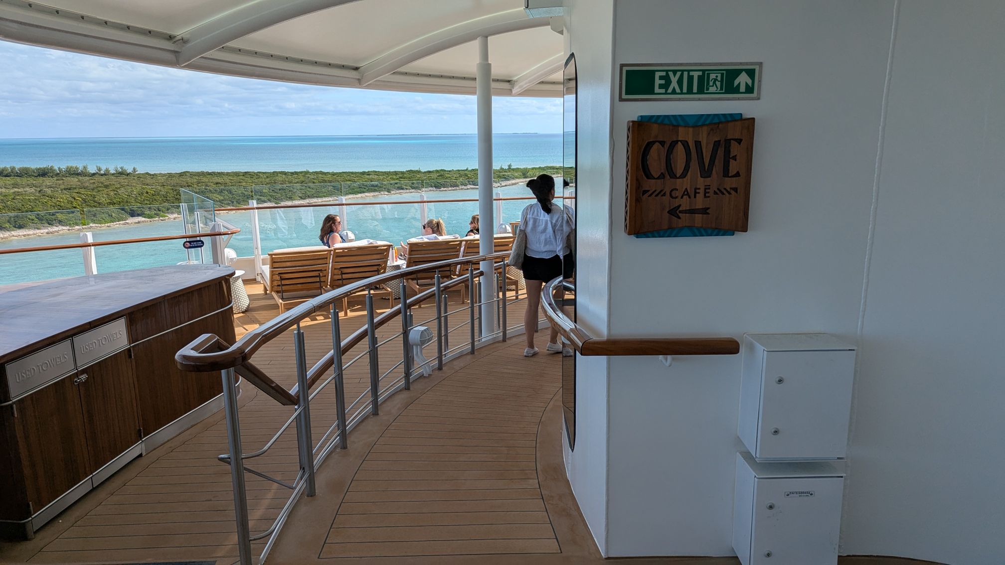 Below you can check out Doobie's photos from the Disney Destiny's adults-only outdoor areas, pools, and the adjacent Cove Cafe, which features Moana-themed artwork.