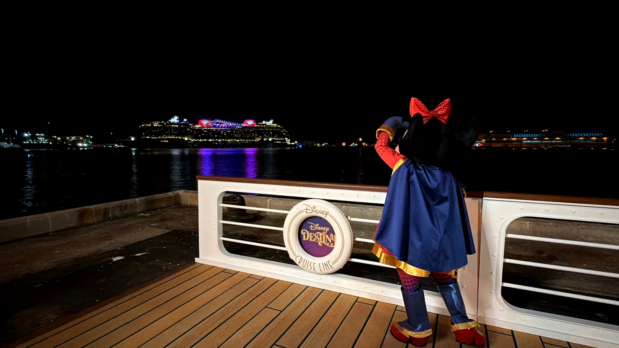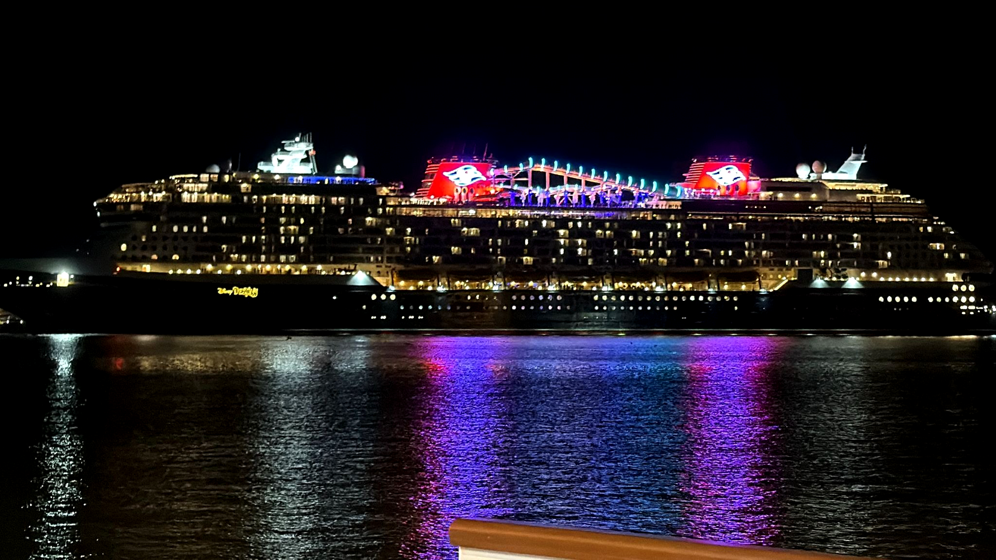 - As it arrived post-sunset, the ship sang to fans celebrating its arrival with a cacophony of horns, including hit Disney songs “Cruella De Vil,” “Hakuna Matata,” “We Don’t Talk About Bruno,” “Grim Grinning Ghosts,” and “Go The Distance.”
