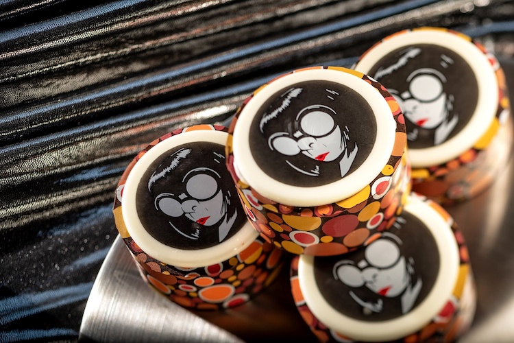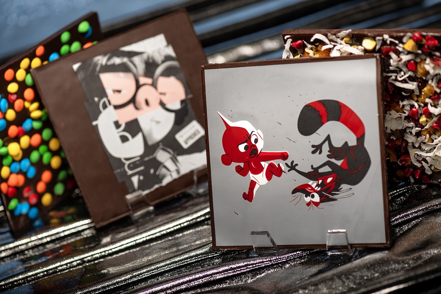 - Edna À La Mode Chocolate Bark Postcard (white chocolate, dark chocolate, and chopped cookies ‘n cream cookies) and Jack-Jack Chocolate Bark Postcard (dark chocolate, milk chocolate, and mini chocolate chip cookies)