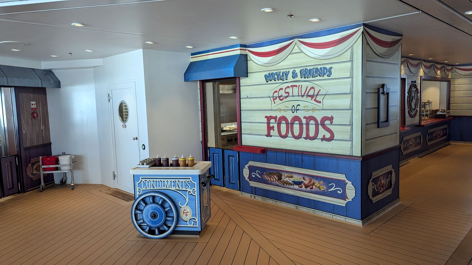 Available on the Wish Class ships of the Disney Cruise Line, which also includes the new Disney Destiny (sister of the Disney Wish and Disney Treasure) that just set off on her maiden voyage just a few days ago, is the Mickey and Friends Festival of Foods. This casual dining space is located just off the pool deck behind Funnel Vision on Deck 11.