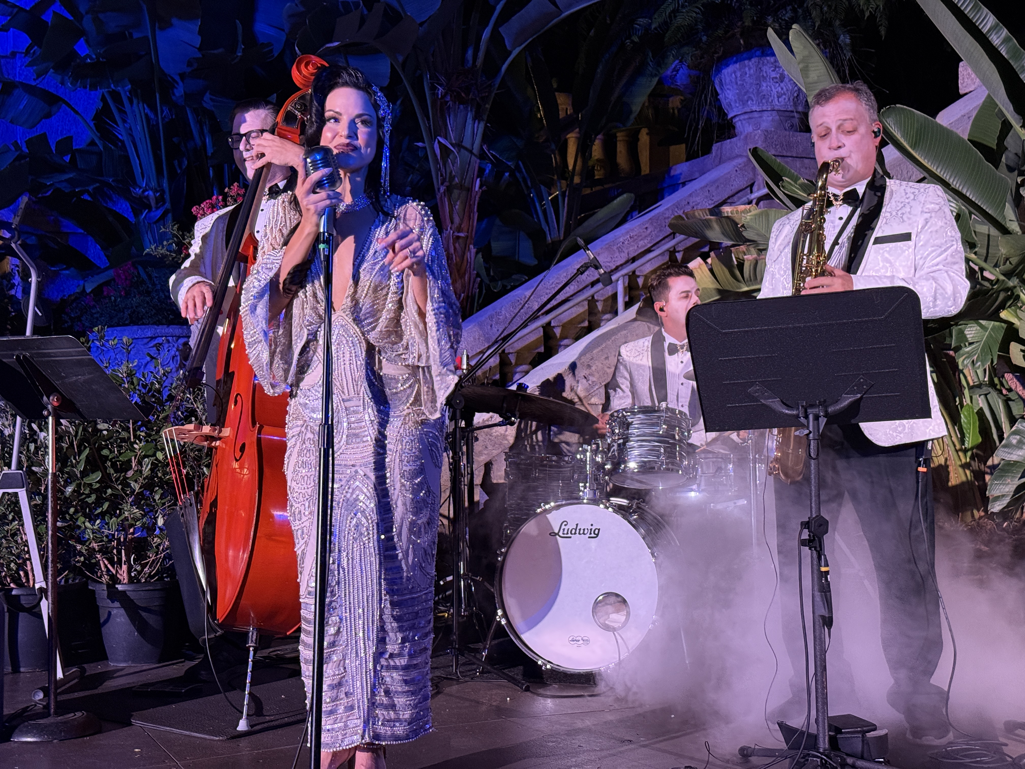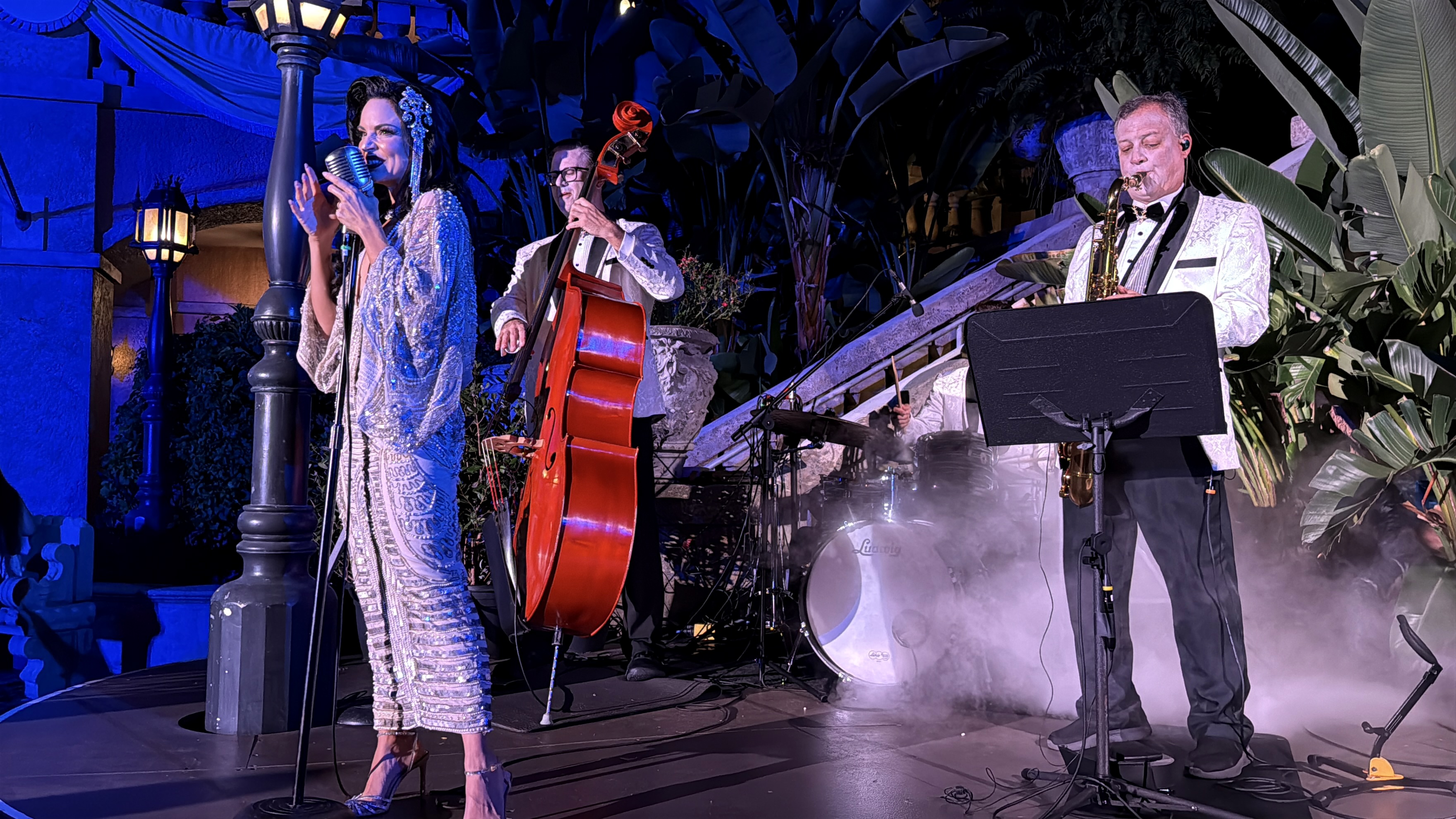 Guests are cordially invited to Twilight Soirée at the Tip Top Club—a swingin' celebration in the courtyard of The Hollywood Tower Hotel where they can sip beverages and unwind in style while a live band swoons and croons holiday tunes.