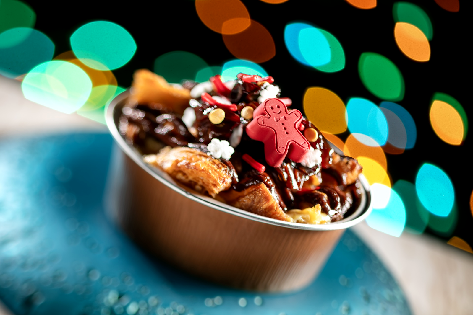 - Holly Jolly Bread Pudding: Warm bread pudding swirled with chocolate-hazelnut spread and topped with cherries, holiday sprinkles, and a chocolate gingerbread man (New)