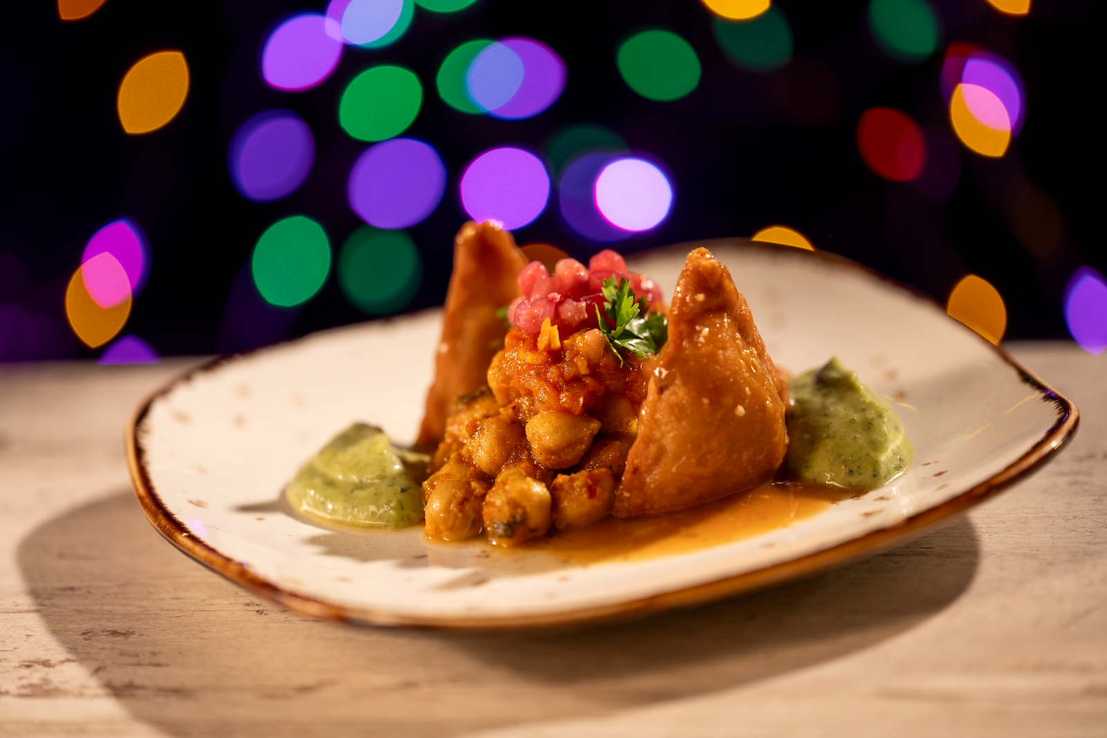 - Loaded Samosas: Potato and pea-stuffed samosas with curried chickpeas, plant-based herb crema, and tomato-pomegranate chutney (Plant-based)