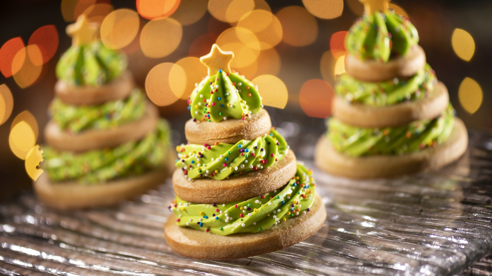 - Christmas Tree Cookie Stack: Vanilla cookie stack filled with pistachio buttercream, cranberry, and raspberry jam, topped with sprinkles and a yellow candy star