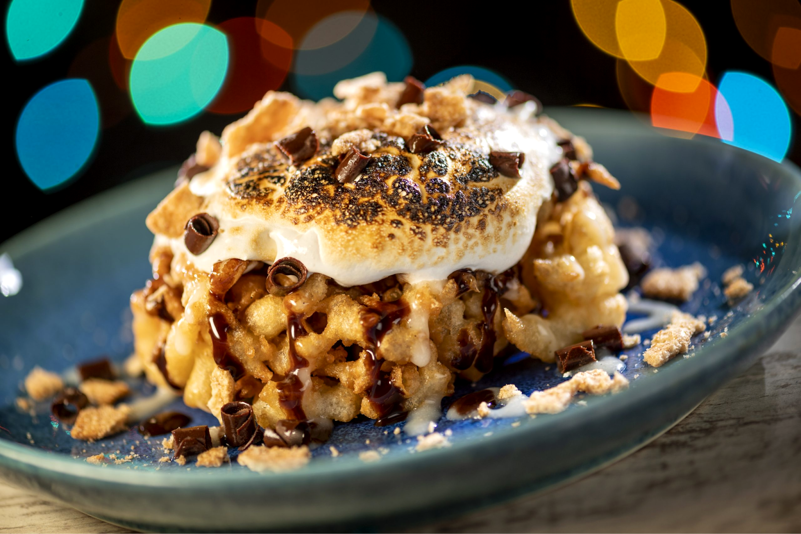 - S’mores Funnel Cake: Mini funnel cake topped with a giant roasted marshmallow, chocolate and marshmallow sauce, chocolate curls, and cinnamon cereal