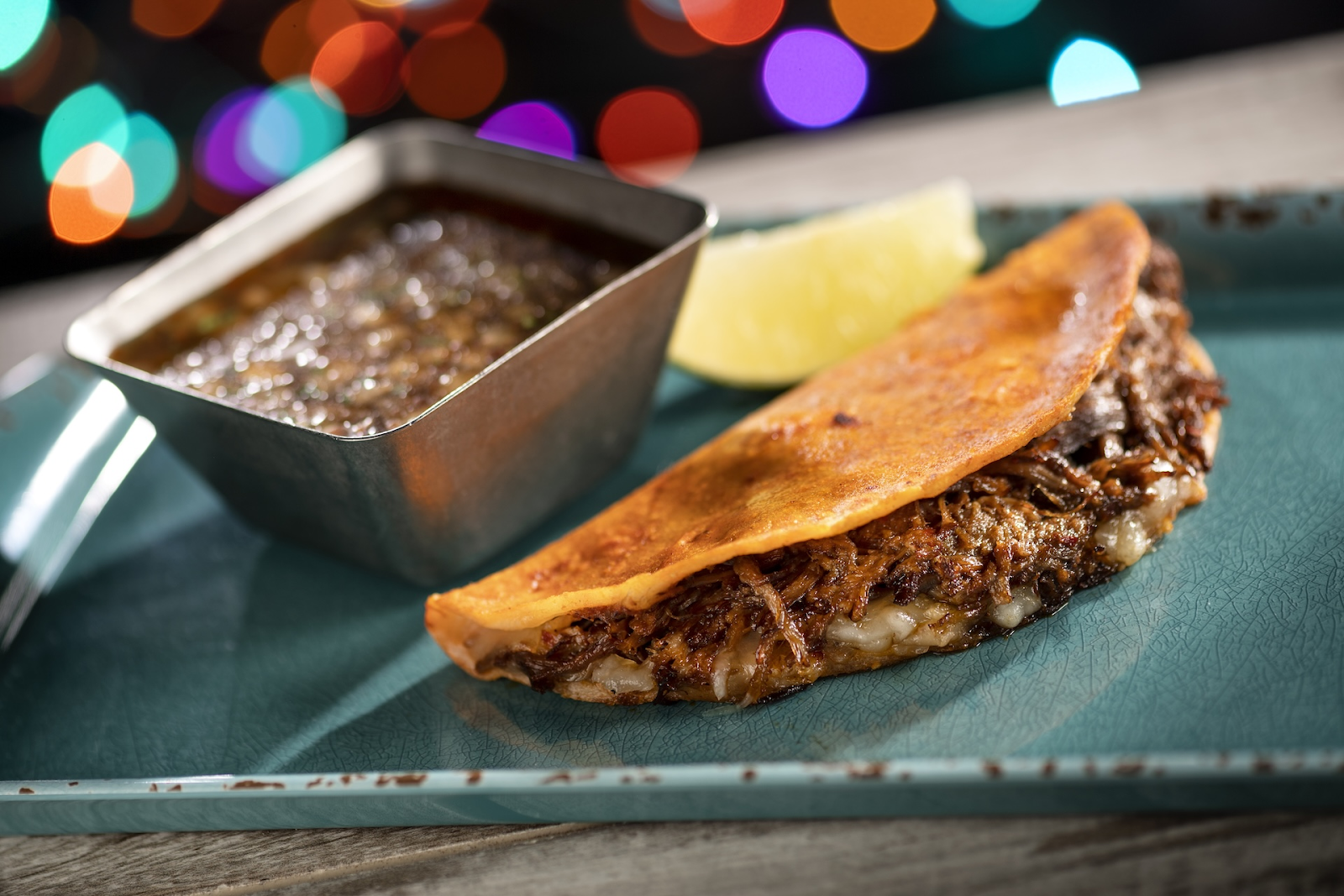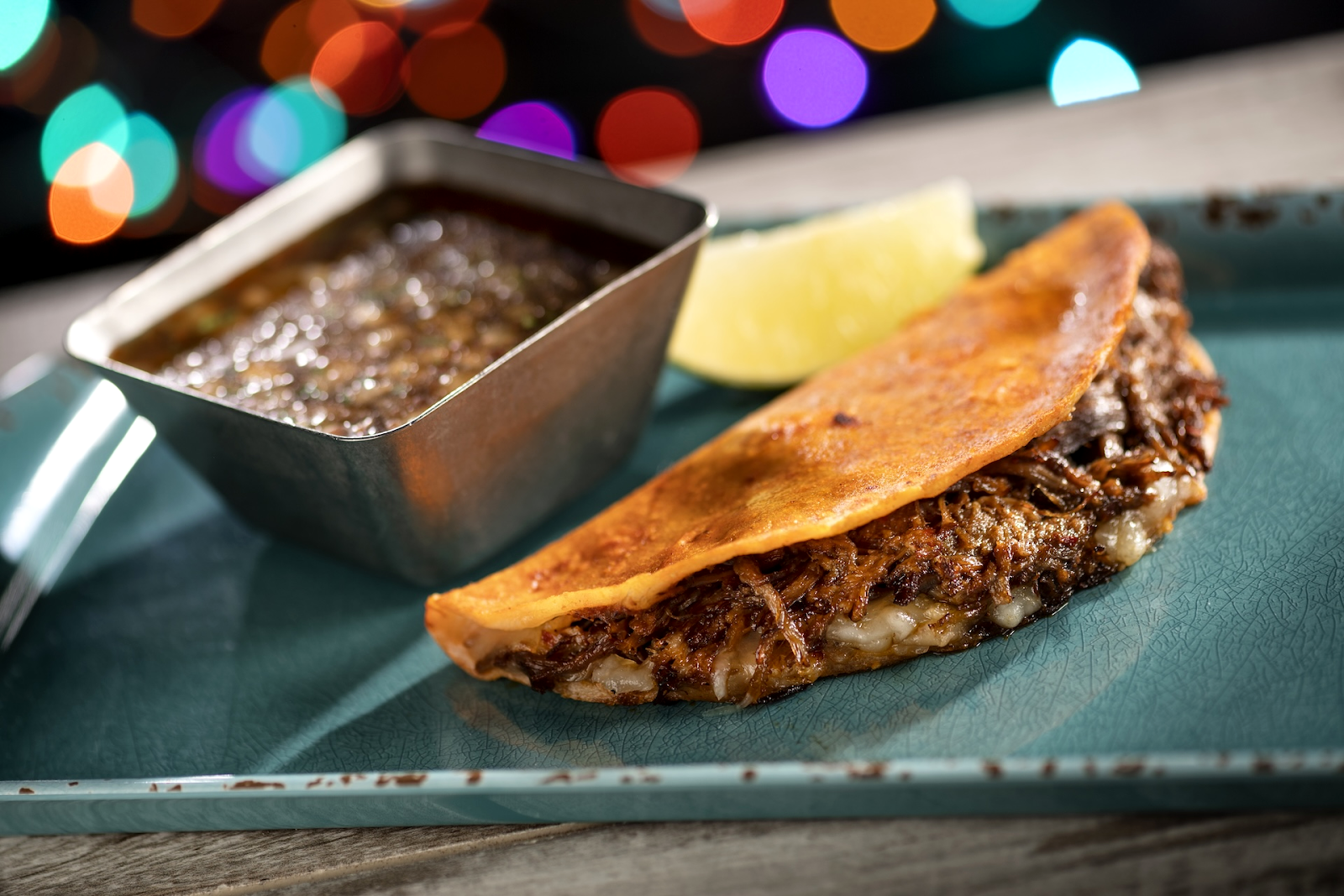 - Birria Taco: Shredded beef and Monterey Jack served with a beef consommé