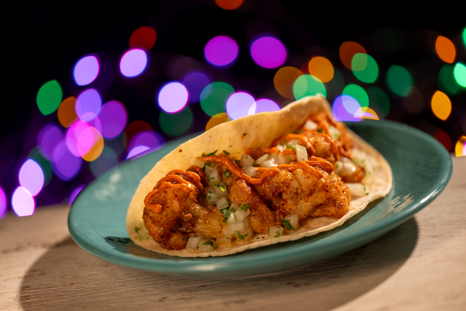 - Cauliflower Taco: Fried cauliflower dusted with chili-lime seasoning on top of a corn tortilla with diced onions, cilantro, and plant-based chipotle cashew crema (Plant-based)