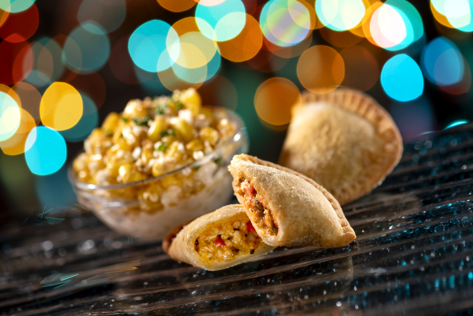 - Empanadas with Street Corn: Chicken empanadas served with street corn salad topped with chili peppers, lime, and cotija