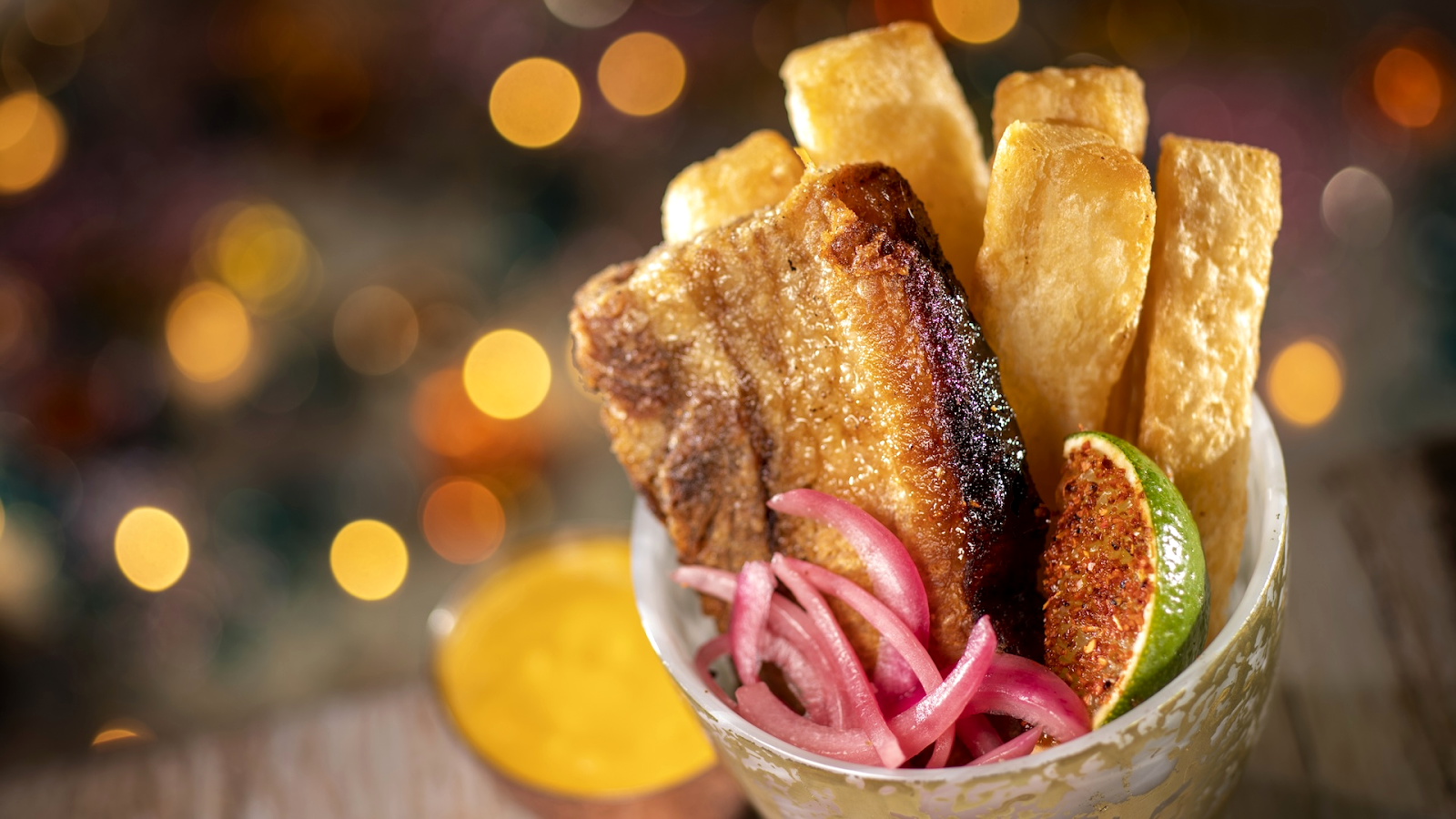 - Yuca con Chicharrón: Fried pork belly, yuca fries, red pickled onions, and chili-lime seasoning with a yellow pepper aïoli