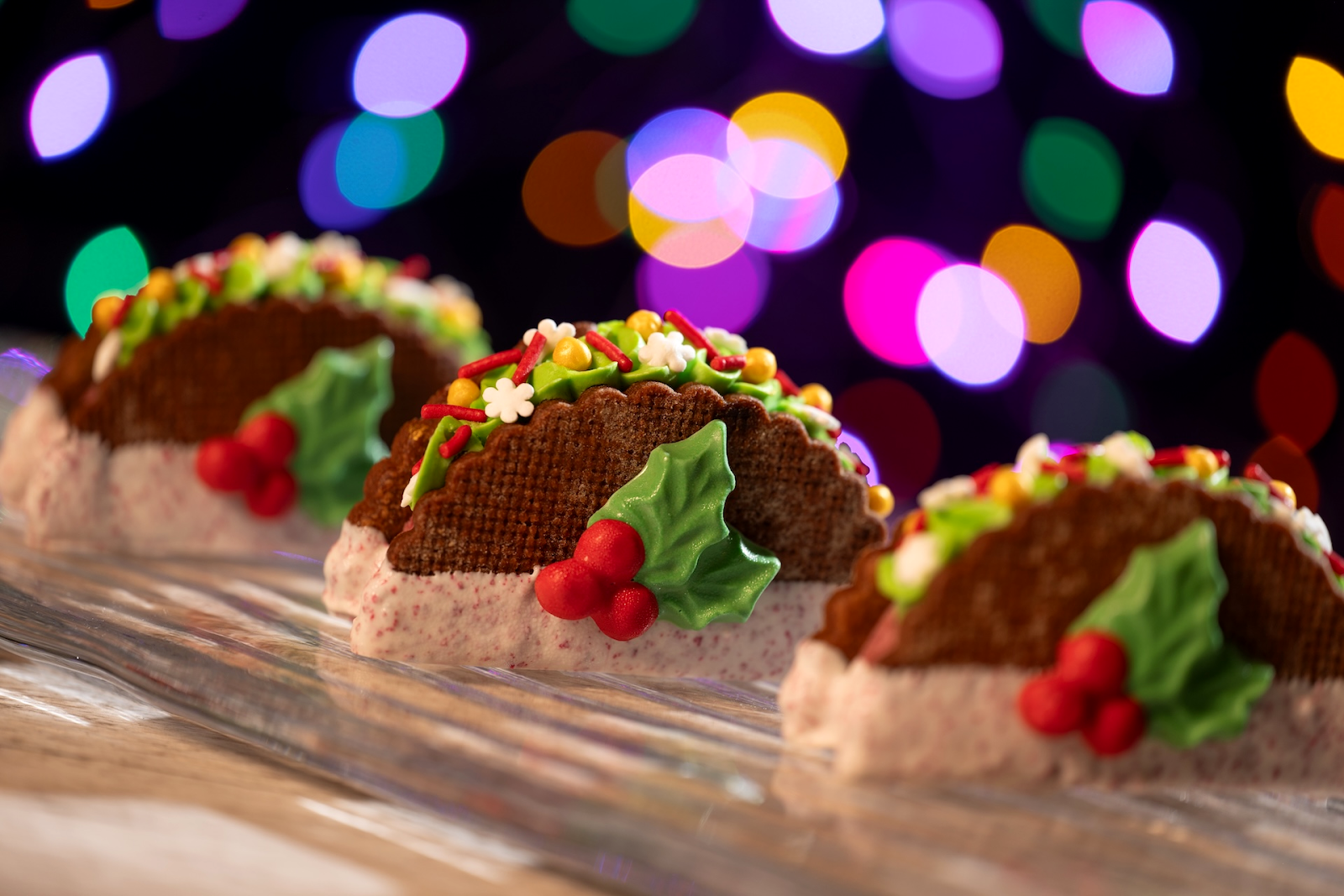 - Taco ‘bout a Holiday Cookie!: Cranberry cheesecake-filled chocolate cookies dipped in cranberry-white chocolate topped with pistachio whipped cream, gold crispy pearls, chocolate holly leaf décor, and holiday sprinkles