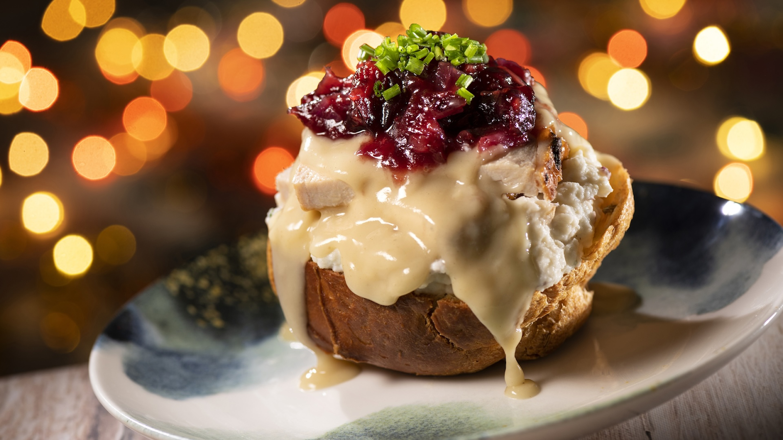 - Holiday Turkey Popover: Roasted turkey and creamy mashed potatoes topped with gravy and cranberry chutney in a house-made popover