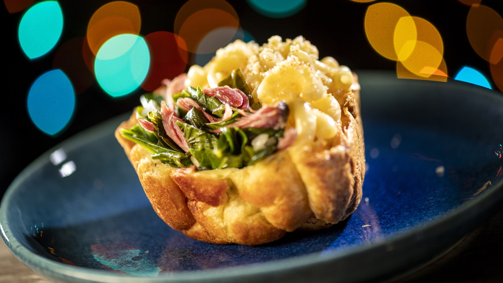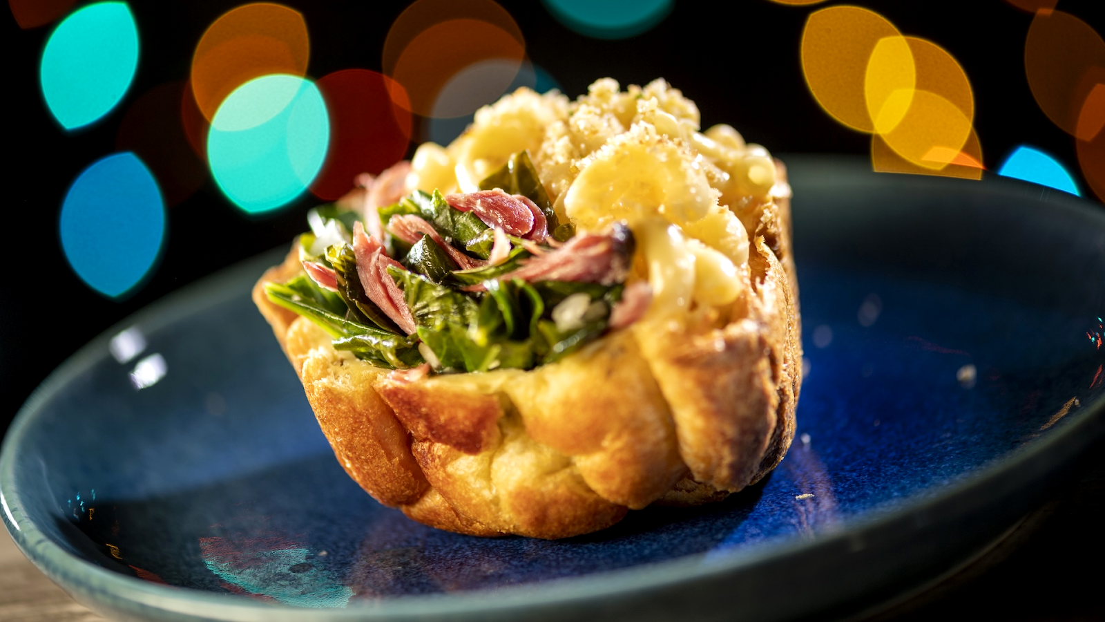 - “Just the Sides” Popover: Macaroni & cheese and savory collard greens topped with cornbread crumbs in a house-made popover