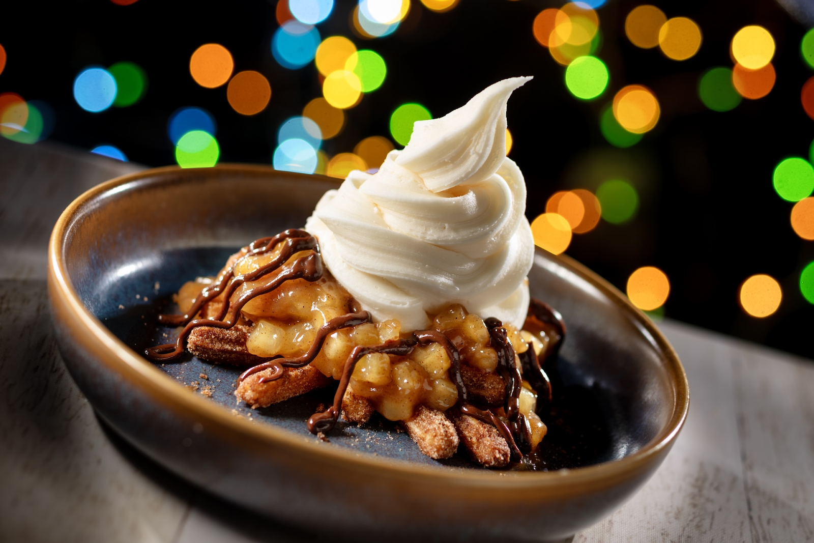 - Churro Sundae: Churros topped with vanilla soft-serve, spiced apples, and spiced chocolate sauce (New)