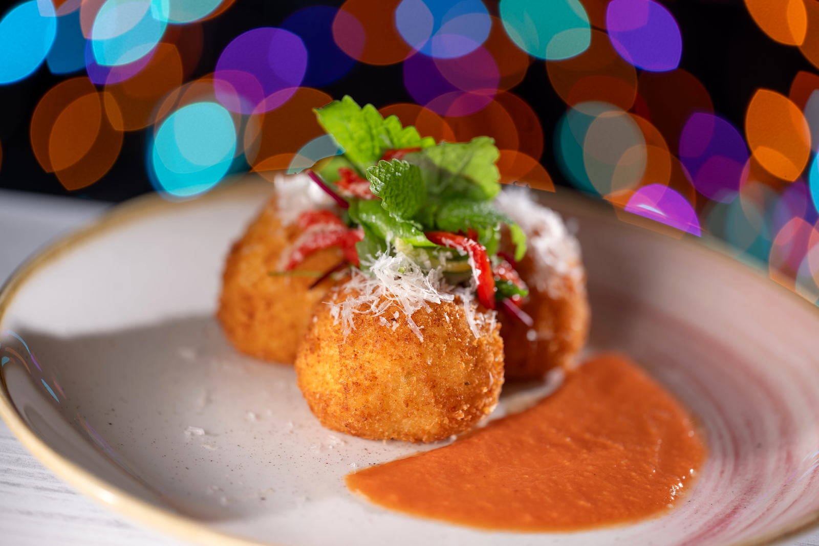 - Chorizo Arancini with shaved Parmesan and salmorejo tomato sauce