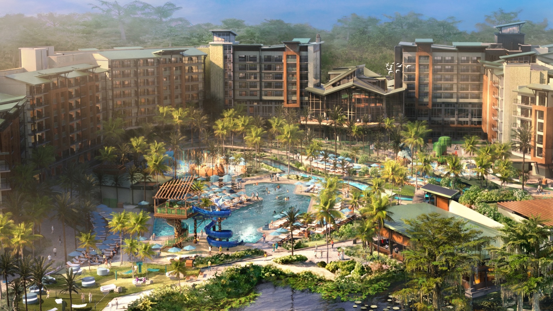 • Newly-released concept art for the resort offers a look at its lush pool area (which includes a lazy river!) and the natural beachfront area overlooking Bay Lake.