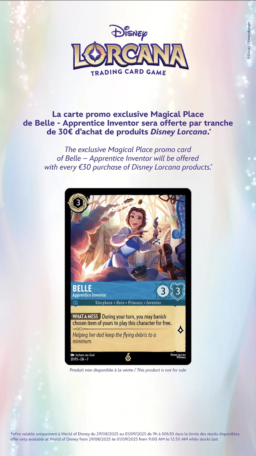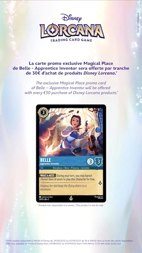- The exclusive Magical Place promo card, featuring Belle - Apprentice Inventor, will be offered to every guest purchasing 30€ or more of Disney Lorcana products.