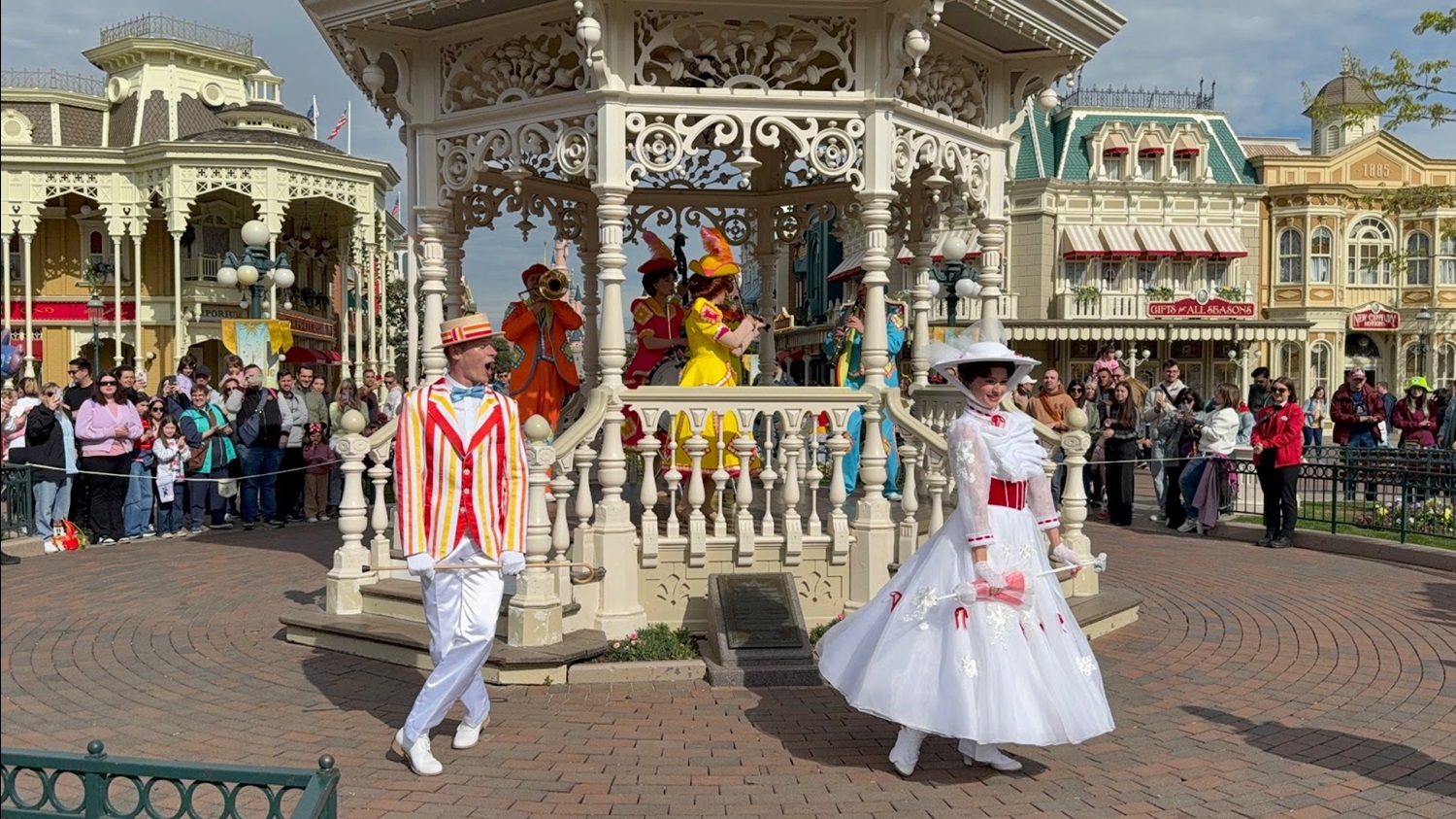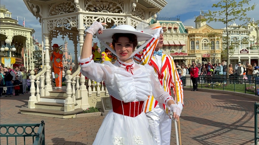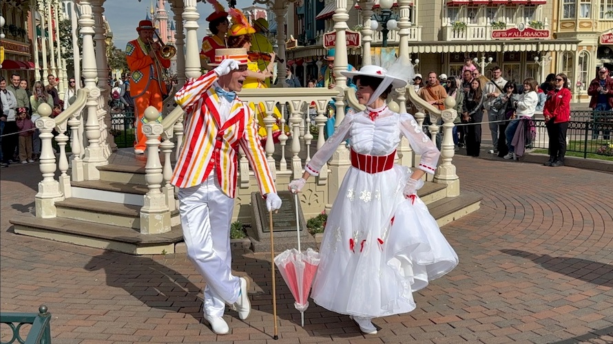 Mary Poppins and Bert sing and dance to classic songs from Mary Poppins and Mary Poppins Returns accompanied by the whimsical sounds of the Pearly Band.