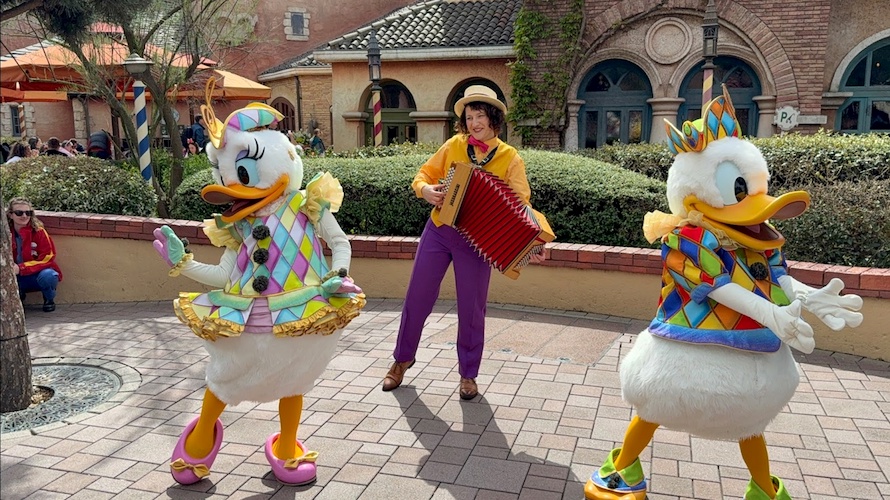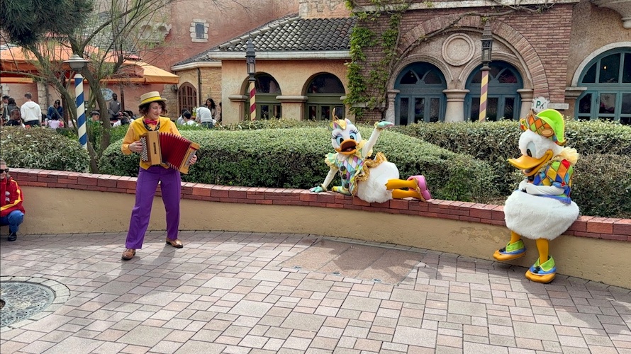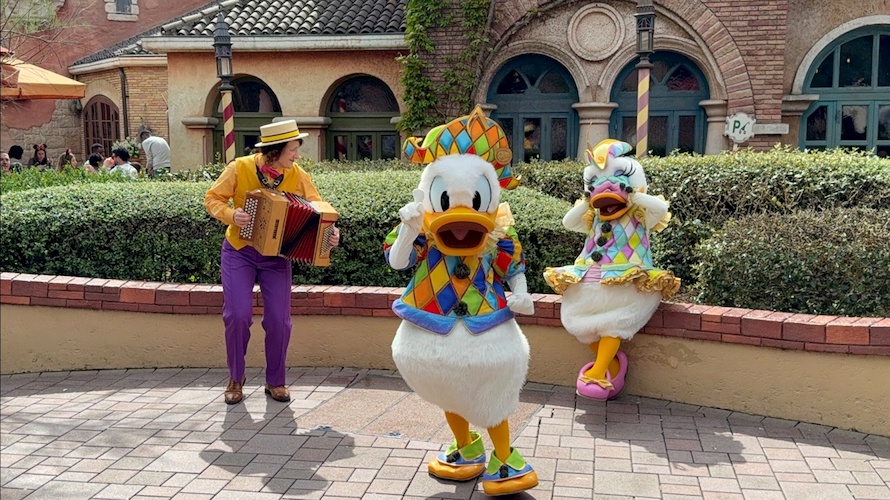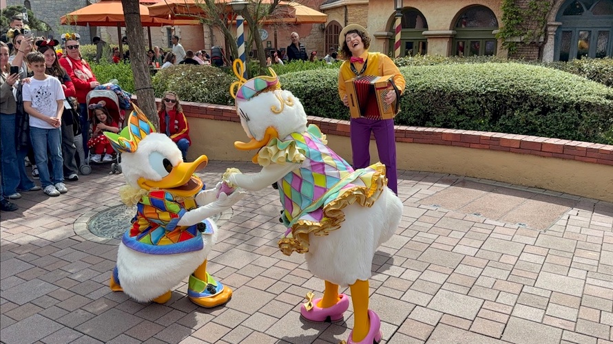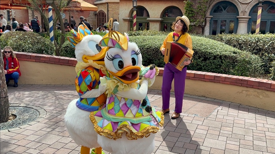 Let yourself be charmed by romantic tunes in a poetic moment with Donald and Daisy in front of Pizzeria Bella Notte.