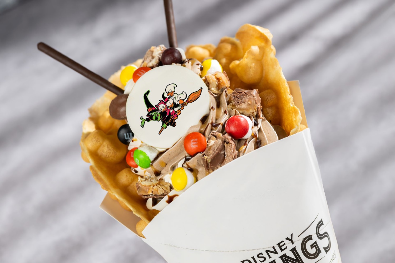 - Trick-or-Treat Waffle: Vanilla and chocolate soft-serve, SNICKERS bar pieces, TWIX cookie bar pieces, M&M’S Milk Chocolate Candies Halloween Blend, SKITTLES POP’d Original Freeze Dried Candy, chocolate fudge, caramel, and chocolate biscuit sticks (New)