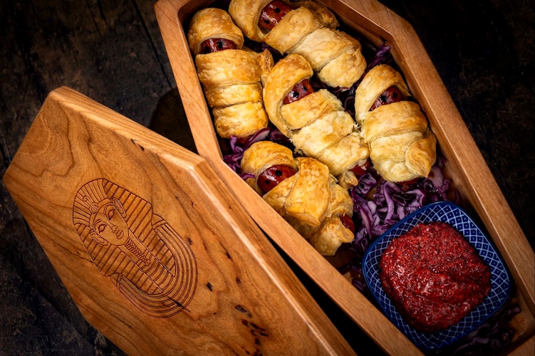- Cursed Mummy Sausages: Mini smoked sausages wrapped in puff pastry and served with pomegranate-mustard sauce (New)