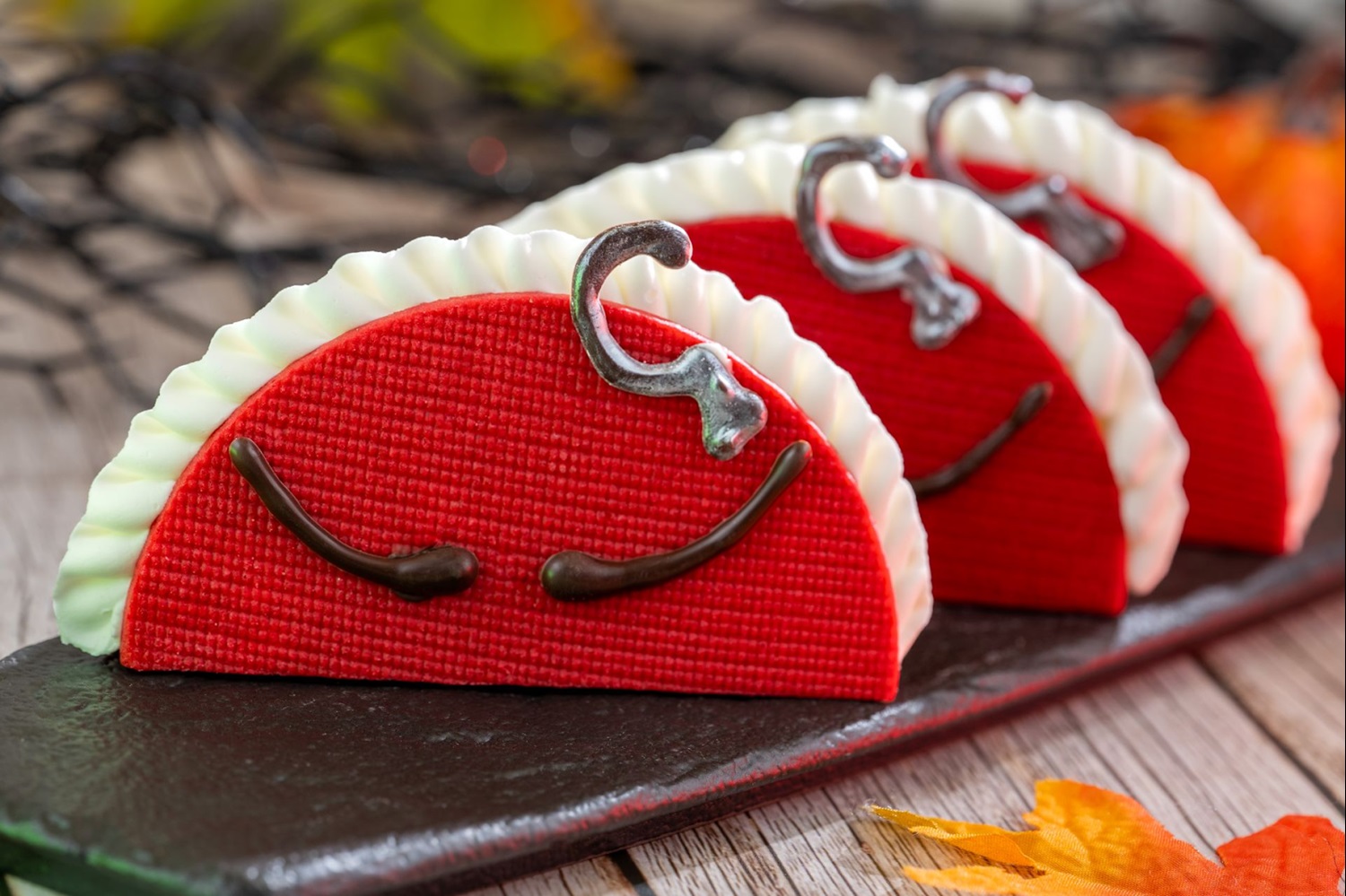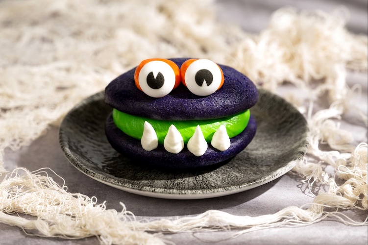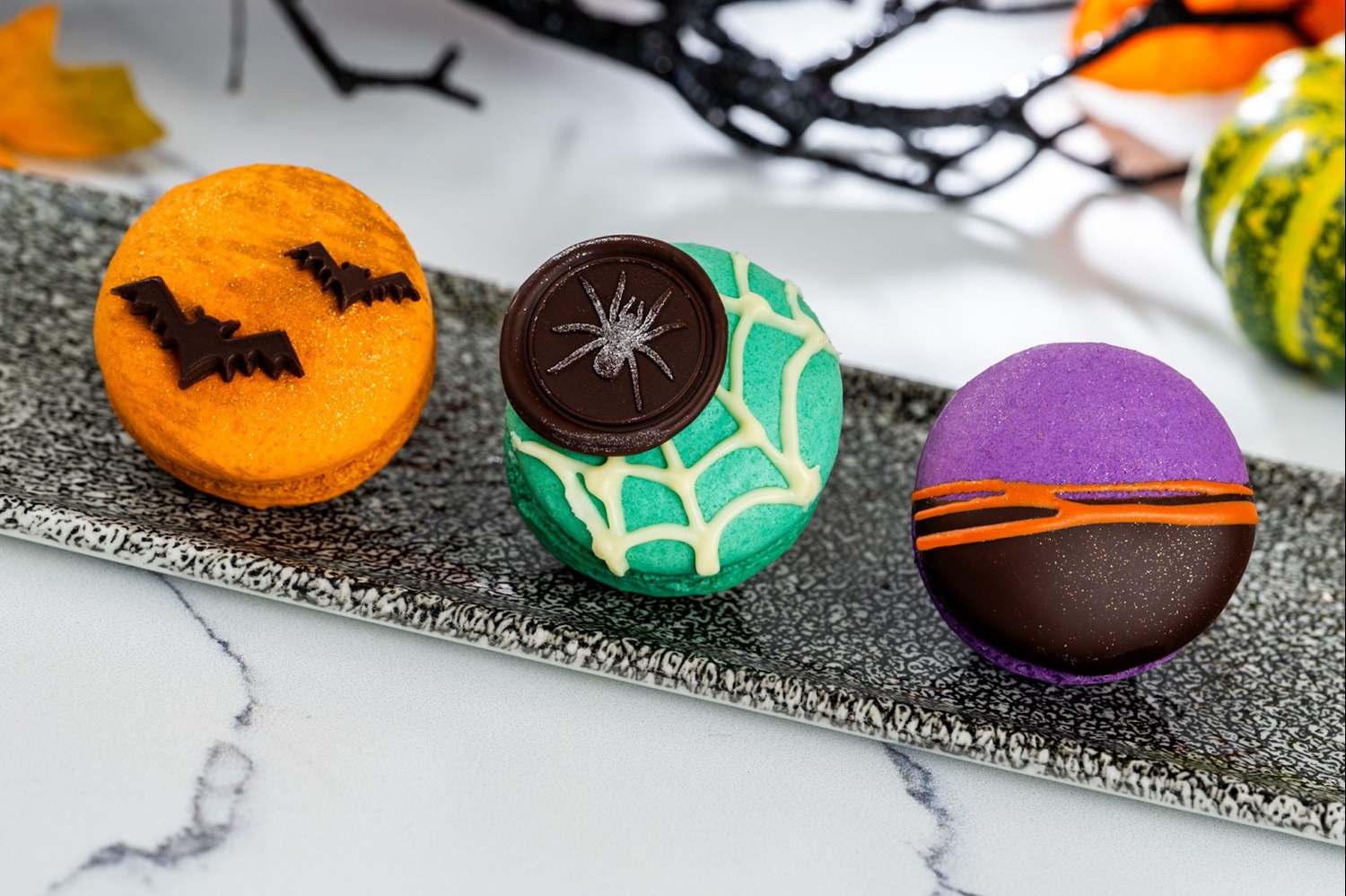 - Halloween Macaron Trio: Pumpkin-spiced milk chocolate, green apple-chocolate, and blood orange-dark chocolate