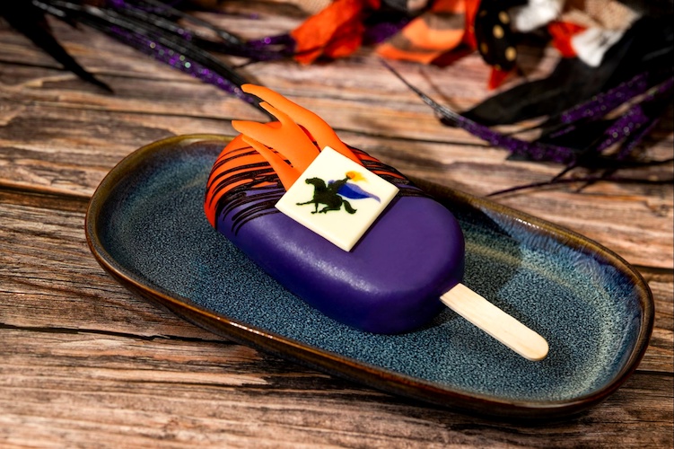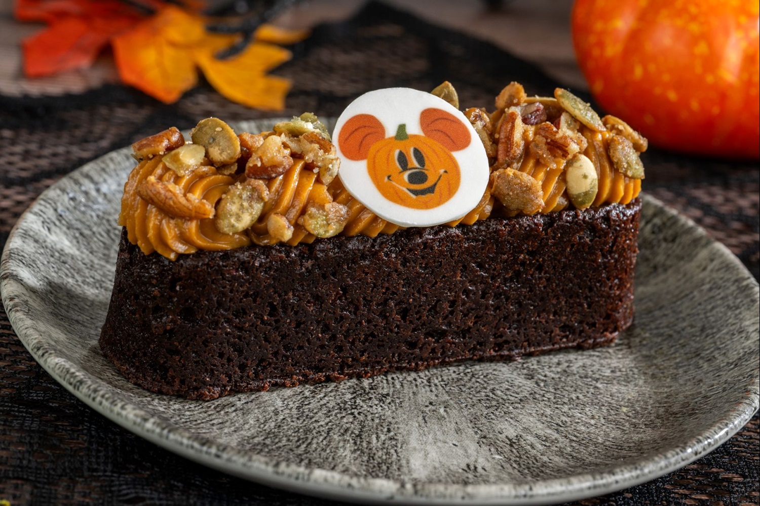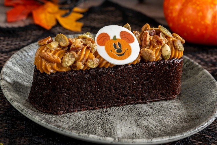 - Mickey Jack-o’-Lantern Cake Bar: Cinnamon sponge mixed with marshmallow mousse and chocolate ganache (New)