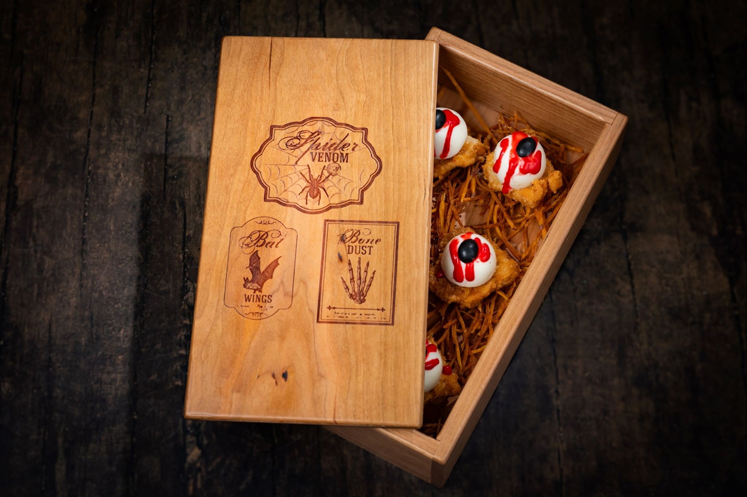 - Zombie Eye Bites: Traditional deviled egg filling, crispy fried chicken, and black olives (New)