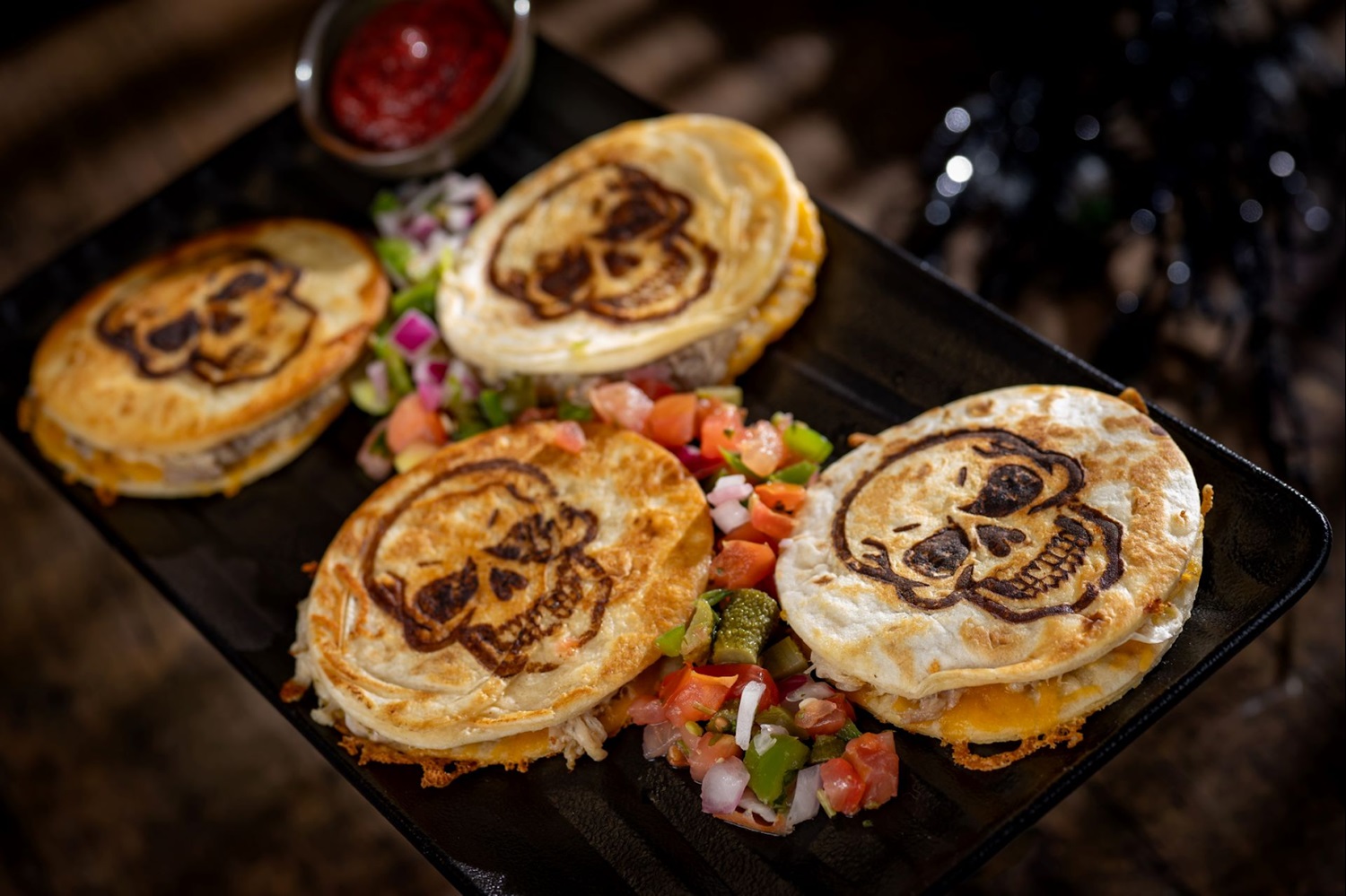 - Skull of the Dead: Mojo pork, cheddar, flour tortilla, and pickle pico de gallo (New)
