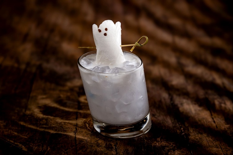 - Ghost in the Glass: Diplomatico Planas, creme de cacao, coconut, cream, and ube foam