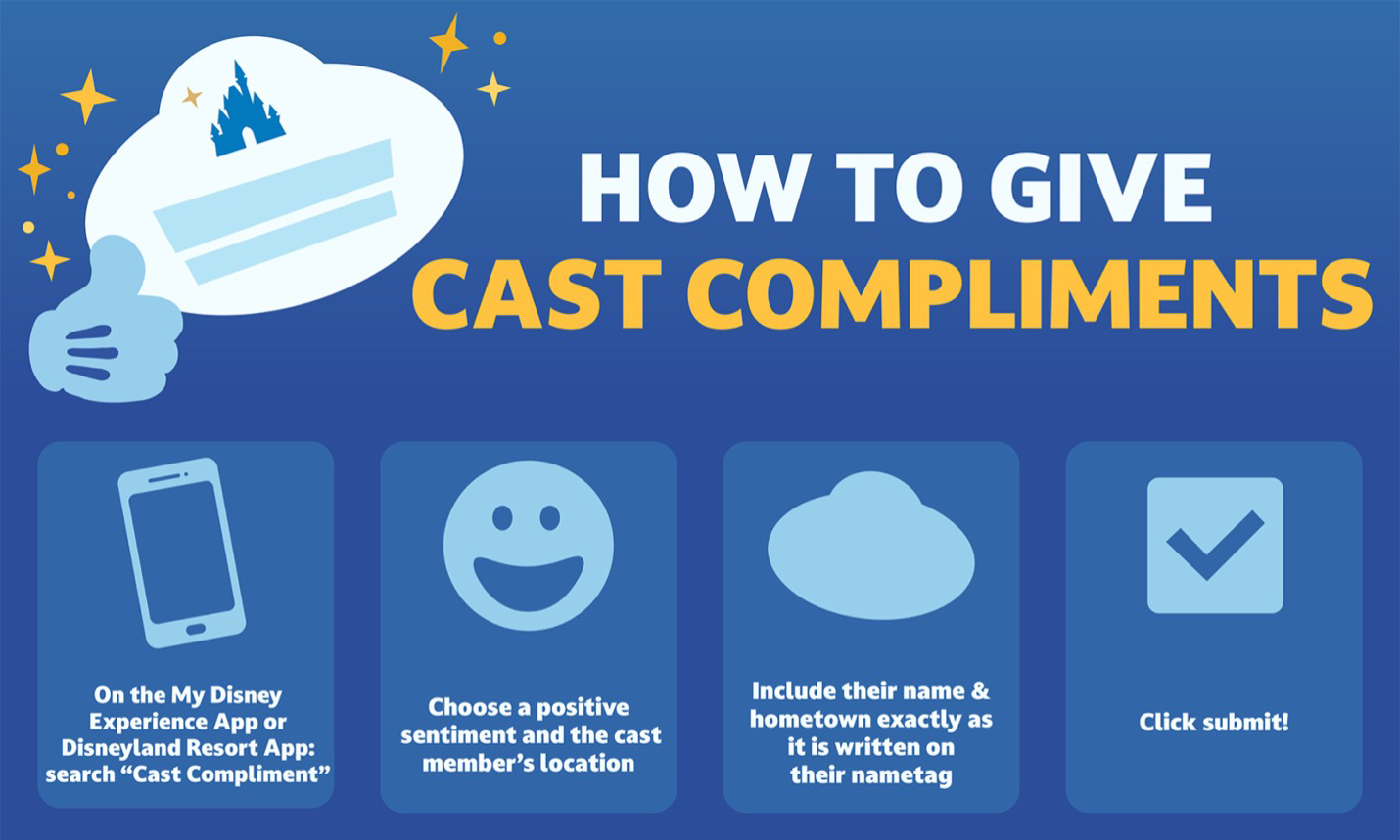 - Mobile Cast Compliments is a feature in the My Disney Experience and Disneyland Resort apps that allows guests to send a heartfelt thank you to cast members.