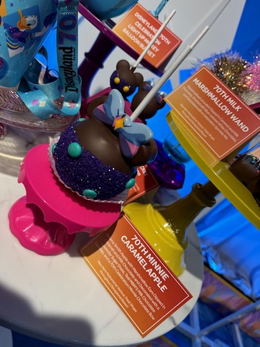 70th Minnie Caramel Apple: Granny Smith apple with marshmallow ears dipped in caramel and milk chocolate and decorated with a lavender sugar dress, teal M&M’S Milk Chocolate Candies, and a 70th Celebration Minnie chocolate bow.