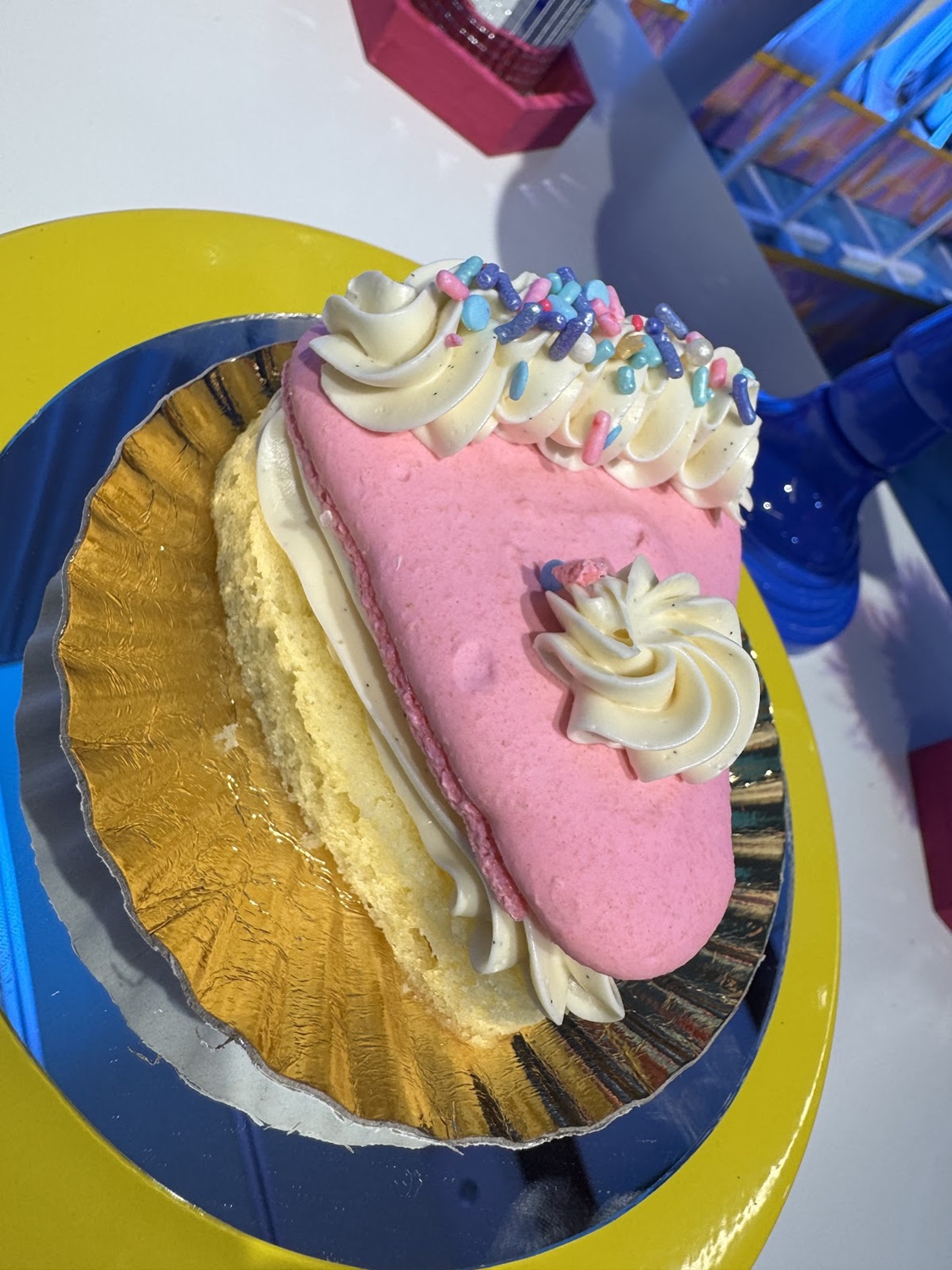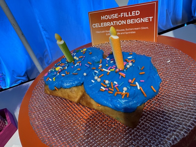 Celebration Beignet: Filled with raspberry mousse, buttercream glaze, edible candle, and sprinkles