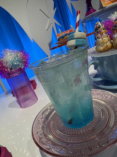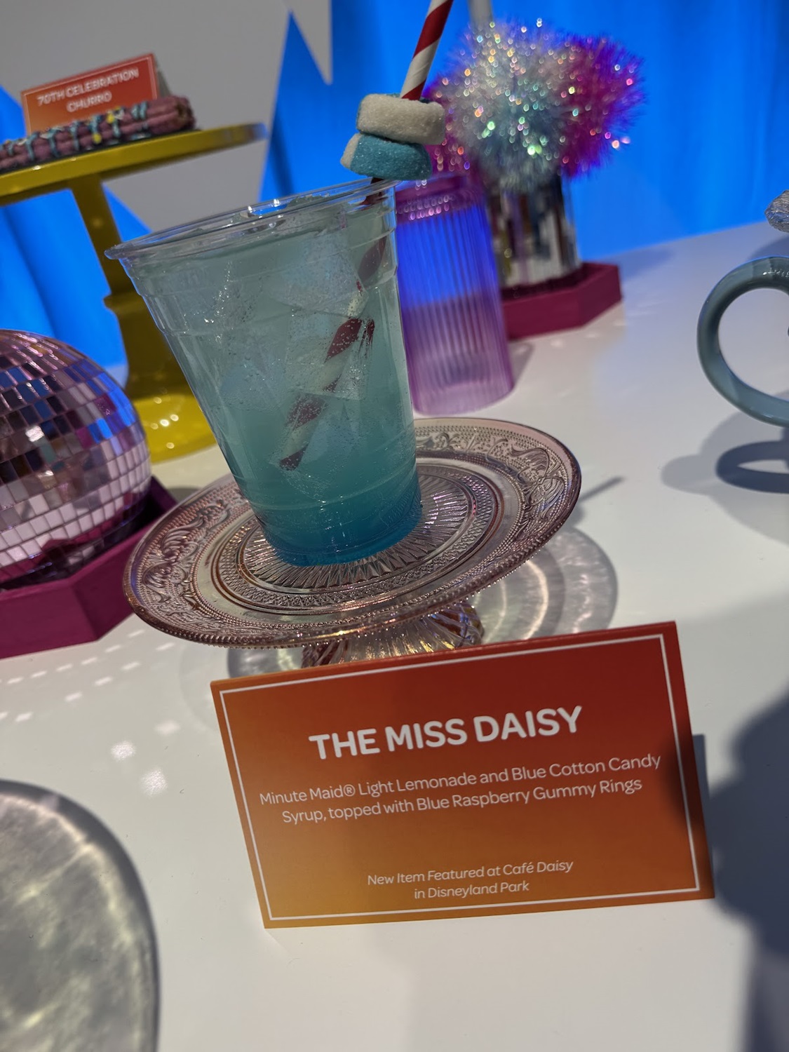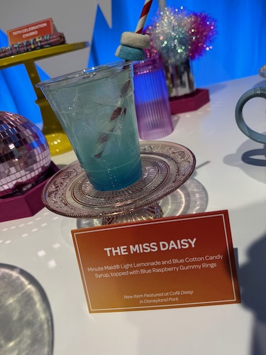 The Miss Daisy: Minute Maid Light Lemonade and blue cotton candy syrup topped with blue raspberry gummy rings (Non-alcoholic)
