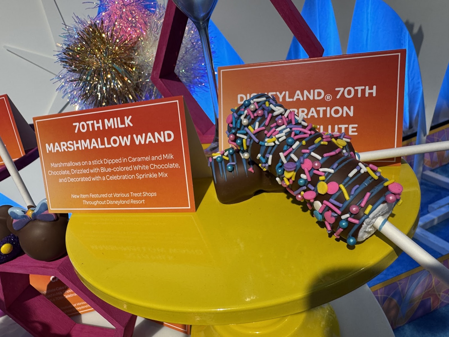 70th Milk Marshmallow Wand: Marshmallows on a stick dipped in caramel and milk chocolate, drizzled with blue-colored white chocolate, and decorated with a celebration sprinkle mix.