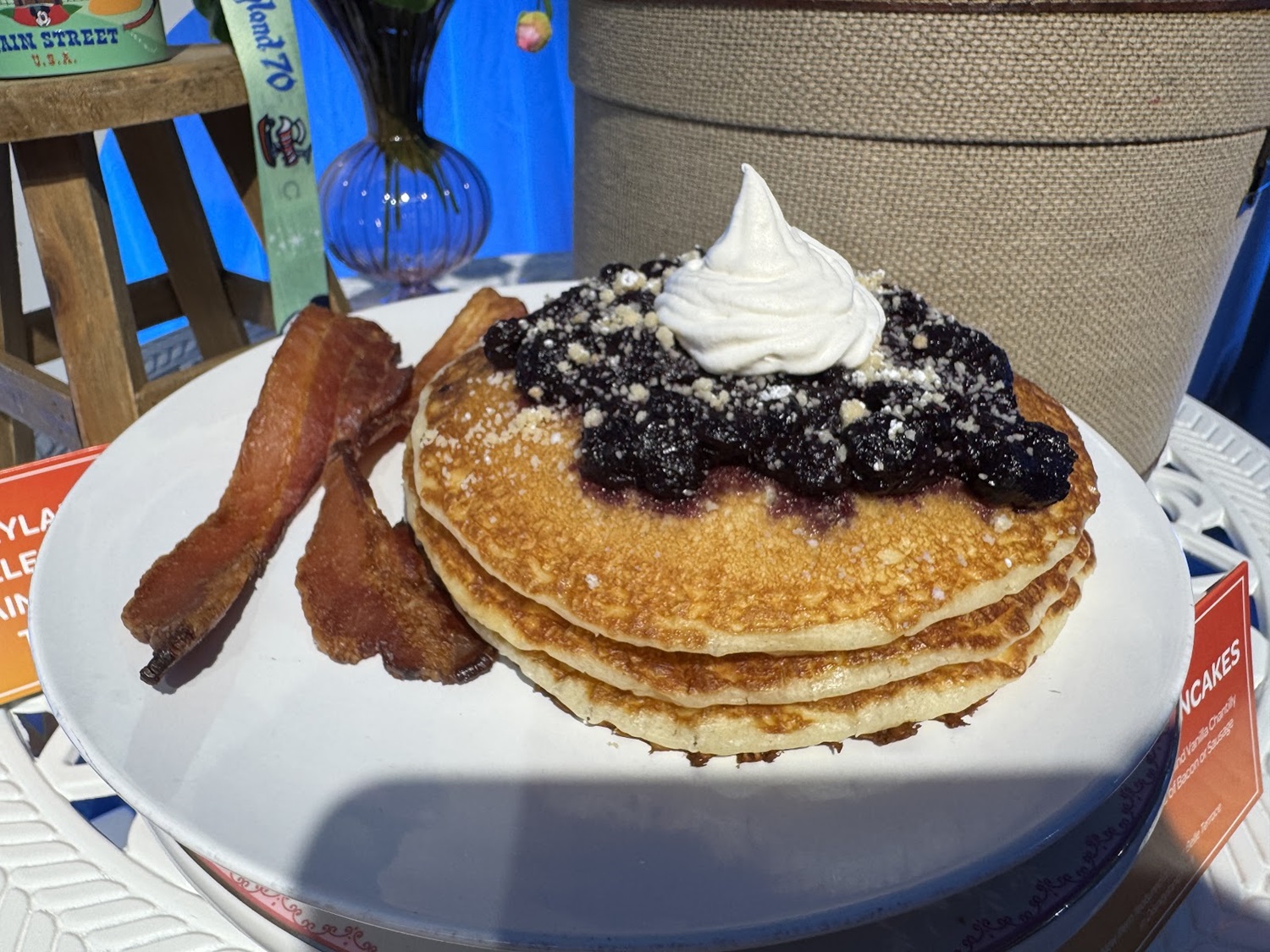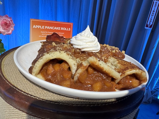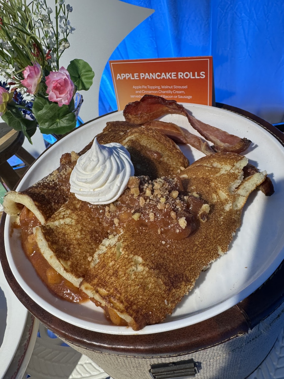 Apple Pancake Rolls: Apple pie topping, walnut streusel, and cinnamon chantilly cream served with choice of bacon or sausage (Available for breakfast only)
