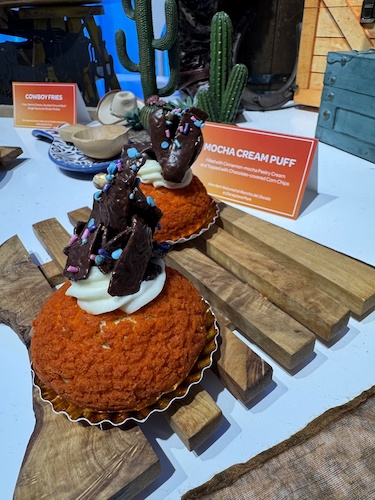 Mocha Cream Puff filled with cinnamon-mocha pastry cream and topped with chocolate-covered corn chips.