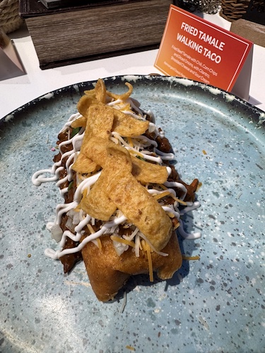 Fried Tamale Walking Taco: Fried beef tamale with chili, corn chips, and diced onions with cilantro, shredded cheese, and sour cream