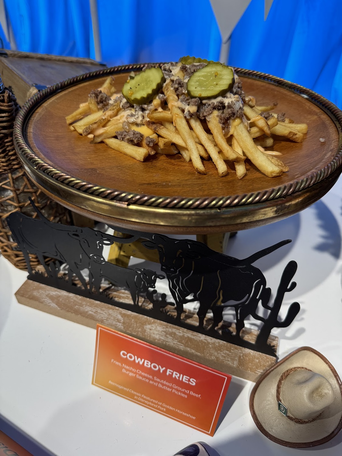 Cowboy Fries: Fries, nacho cheese, sautéed ground beef, burger sauce, and butter pickles