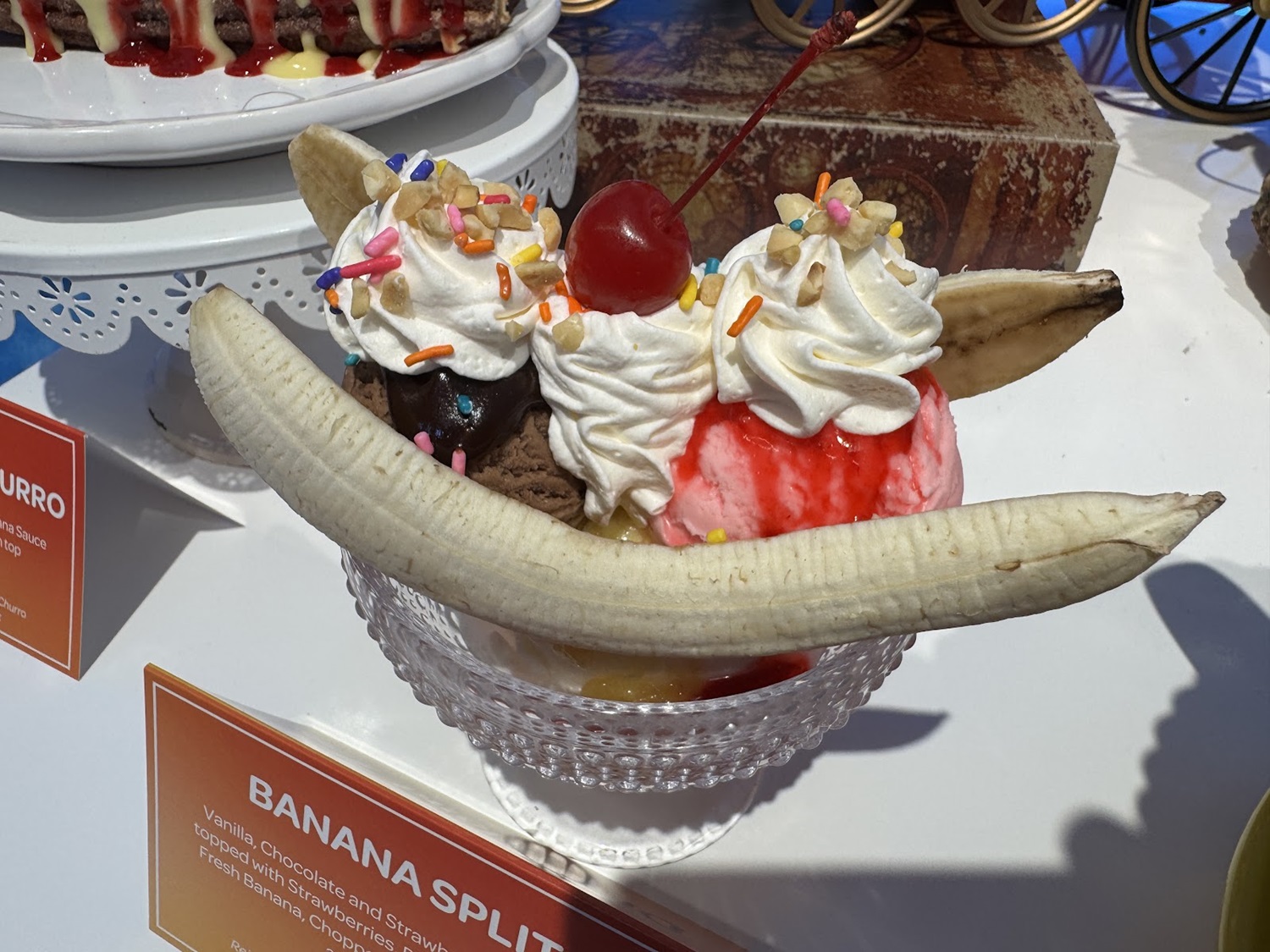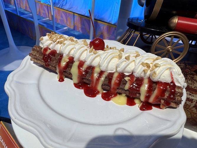Banana Split Churro: Classic churro rolled in chocolate sugar with banana sauce and vanilla sauce with a cherry on top