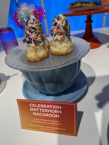 Celebration Matterhorn Macaroon: Coconut macaroon dipped in white chocolate and sprinkles.
