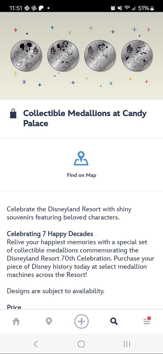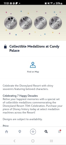 Appropriately enough, you’ll be able to find them at the Candy Palace on Main Street USA, where they are available in the machines for $6.00 each or $20.00 for all four. The official Disneyland app indicates that collectible medallions are available here, and it is unclear at this time if more designs will be added to the collection or more machines will appear throughout the resort, as has occurred in past park celebrations like the 100 Years of Wonder at the Disneyland Resort, marking the 100th anniversary of the Walt Disney Company.