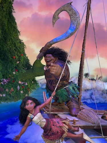 - Aboard Moana’s wayfinding boat, Maui and her animal friends can be seen riding rough waters as the ship moves back and forth as if it was moving through the ocean.