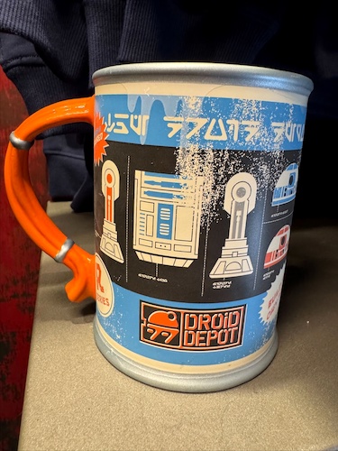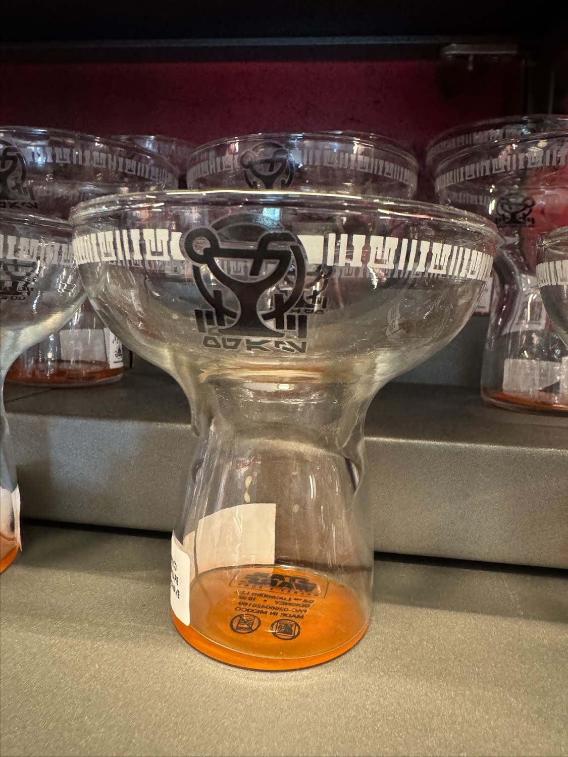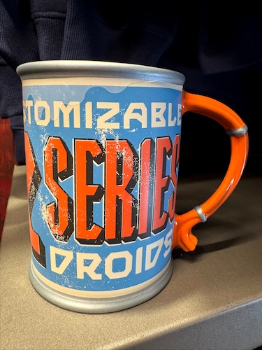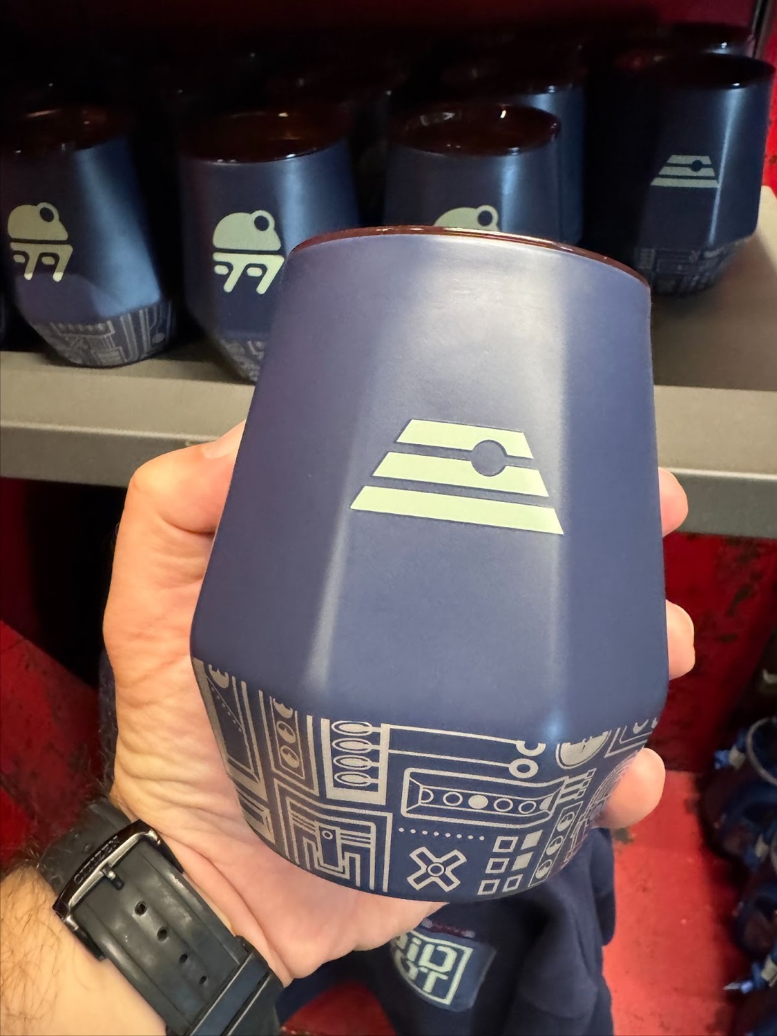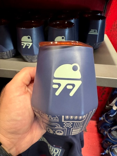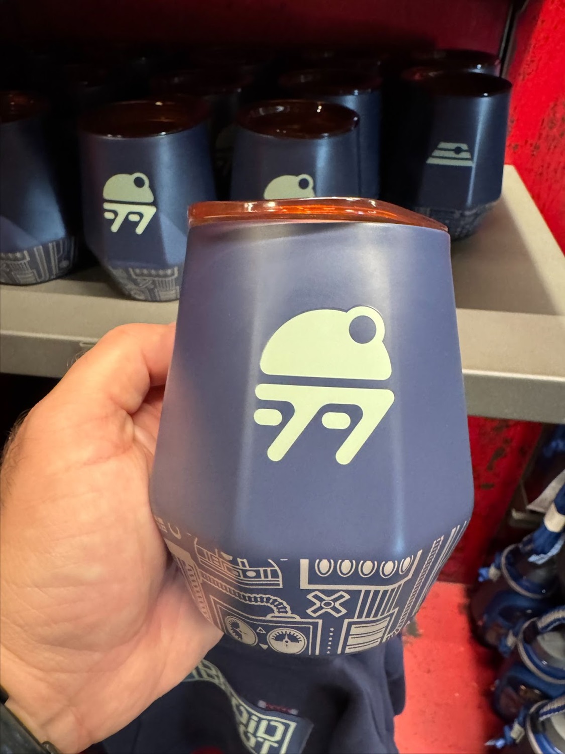 The first thing that jumped out at me were two new pieces of glassware featuring the Oga’s Cantina logo and some Aurebesh writing. These are not droid-related in any way, so I have to wonder if they were intended to be made available in Oga’s itself. The smaller glass ($19.99) has the Oga’s logo and says– unsurprisingly– “Oga’s" in Aurebesh. The Aurebesh on the larger glass (also $19.99) reads “Beverages / Music / Food."