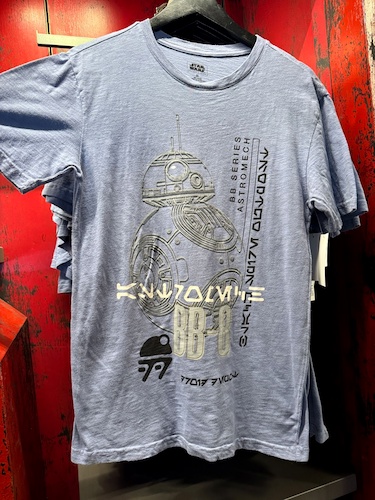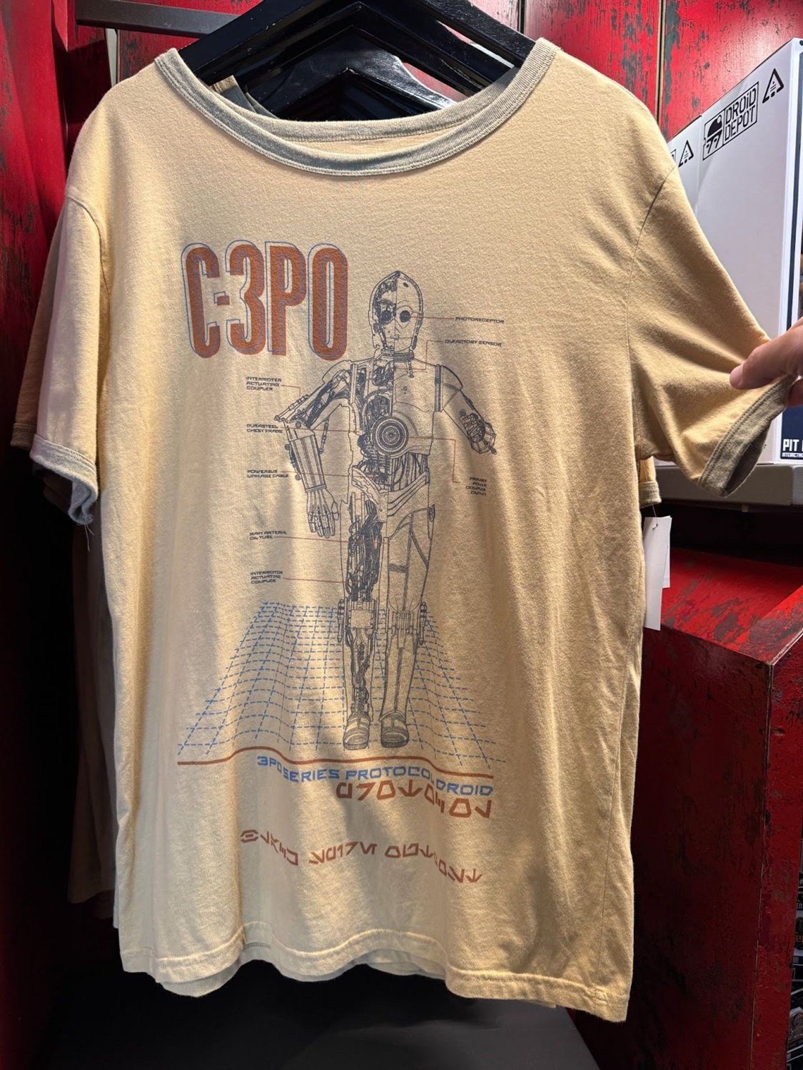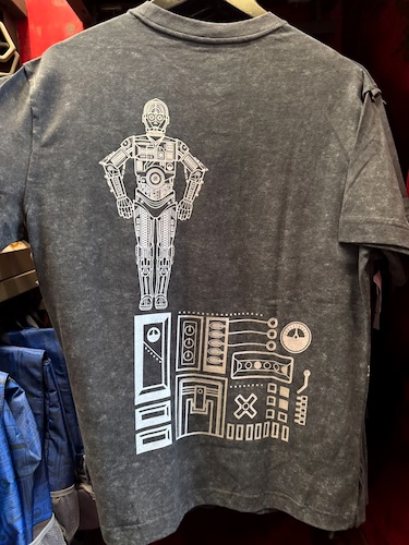 This next section has new shirts depicting the famous droids C-3PO ($34.99)-- with Aurebesh reading “Protocol" and “Black Spire Outpost"-- and BB-8 ($34.99)-- with Aurebesh reading “Astromech," “Droid Depot," and “Black Spire Outpost."